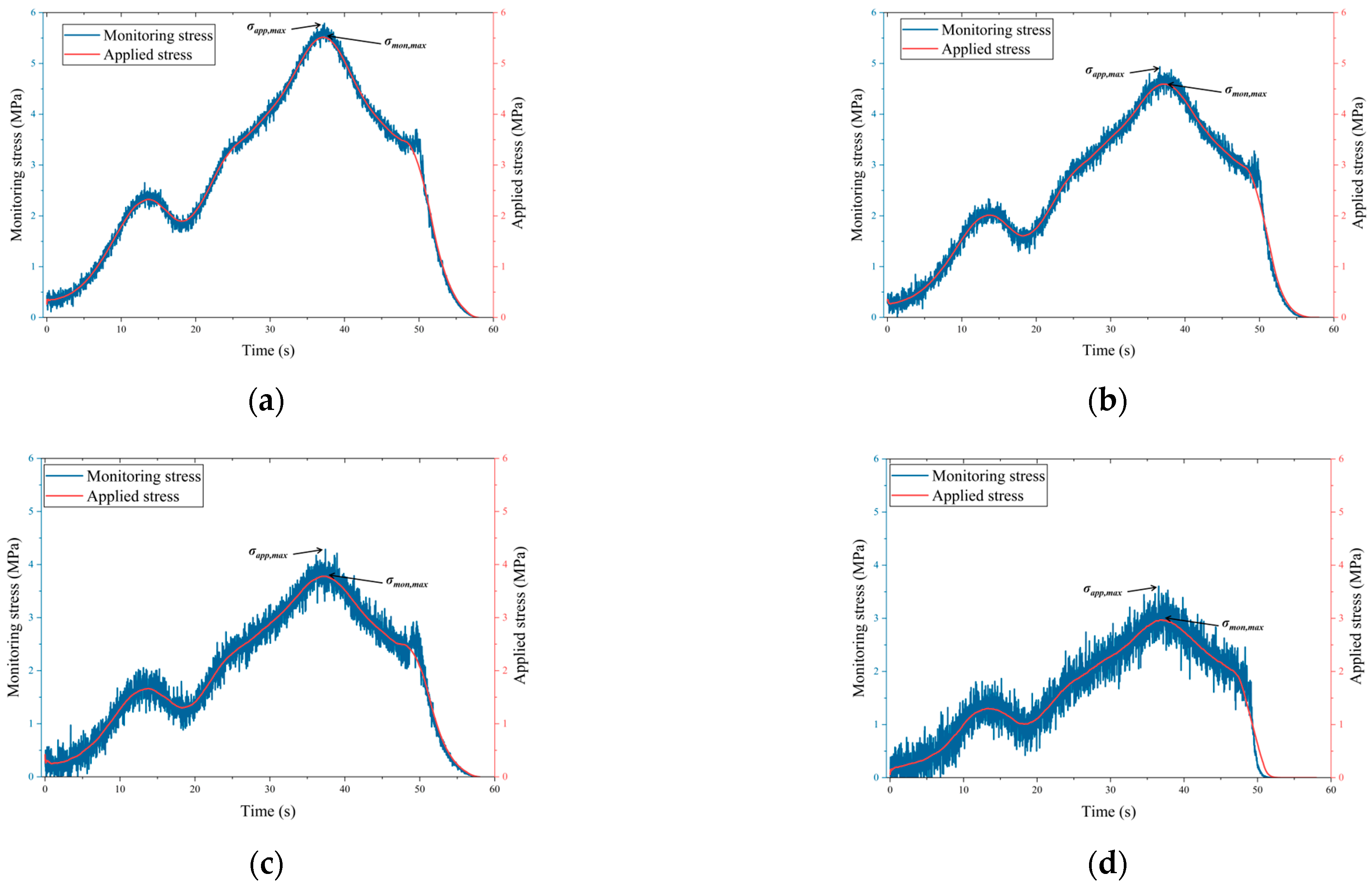 Figure 9. Comparison of stress monitoring results of the test samples: (a) Specimen without initial damage; (b) Specimen with 30% initial damage; (c) Specimen with 50% initial damage; (d) Specimen with 70% initial damage.