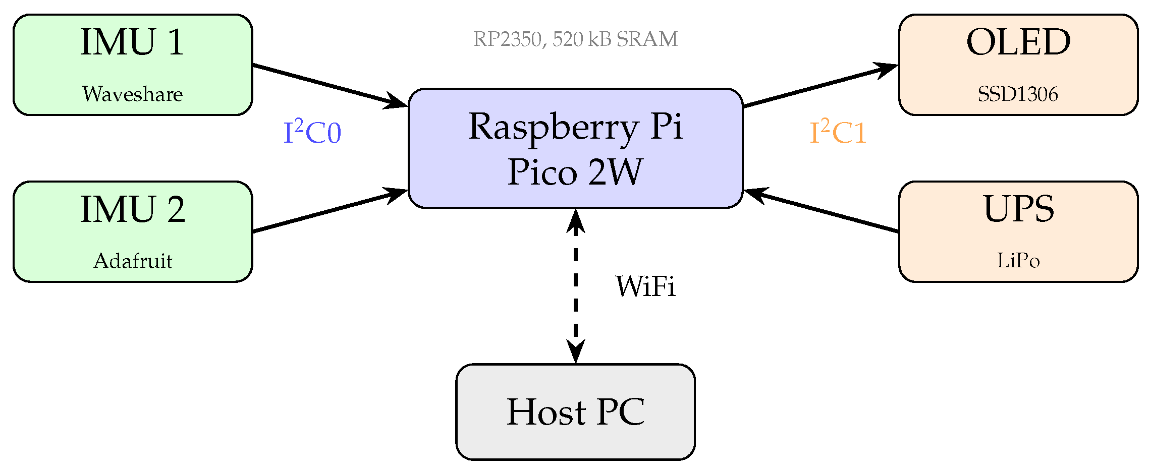The prototype measurement system was designed to verify implementation of step detection algorithms for future edge deployment. The platform was based on the Raspberry Pi Pico 2W microcontroller featuring dual ARM Cortex-M33 cores operating at 150 MHz with 520 kB SRAM, 4 MB flash memory, and integrated Wi-Fi connectivity [14]. This microcontroller represents a typical target for edge computing applications, offering sufficient computational resources for real-time signal processing while maintaining low power consumption. The upgraded memory capacity (520 kB vs. 264 kB in the original Pico W) proved essential for reliable operation when combining the sensor acquisition with wireless data transmission.