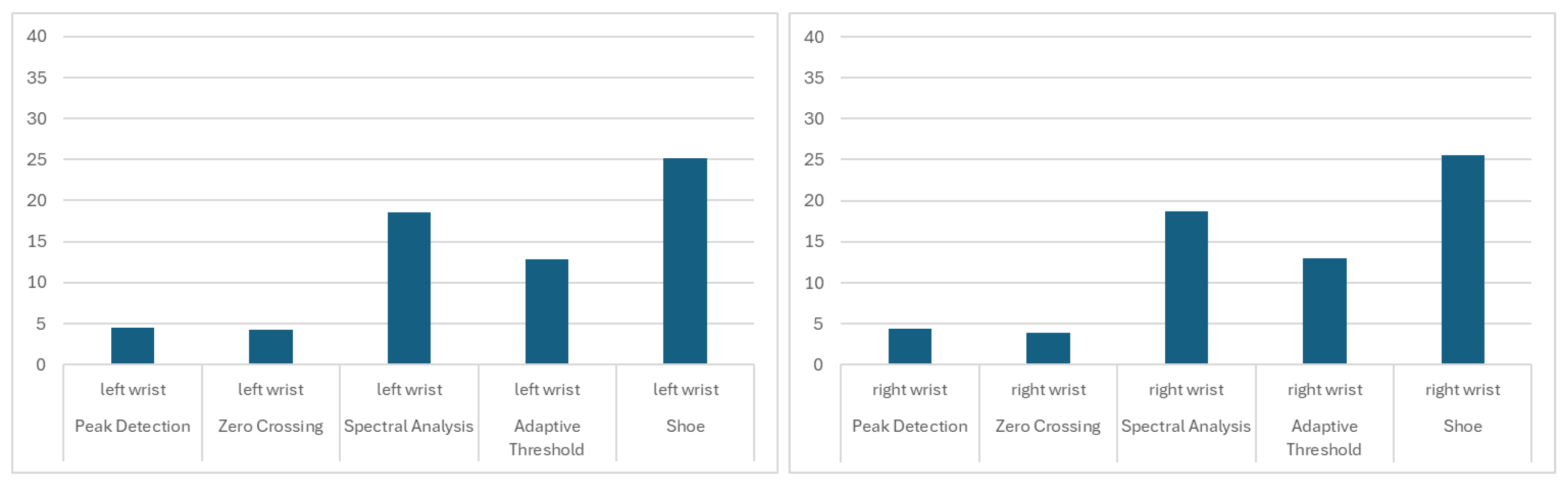 Table 2 summarizes the mean F1-scores across all scenarios and mounting locations. Peak Detection achieved the highest overall performance (F1 = 0.82), followed by Spectral Analysis (0.81), Adaptive Threshold (0.77), Zero-Crossing (0.76), and SHOE (0.75). The performance range indicates substantial variability across experimental conditions, with all algorithms achieving both excellent (>0.90) and poor (<0.60) results depending on the specific scenario–location combination.