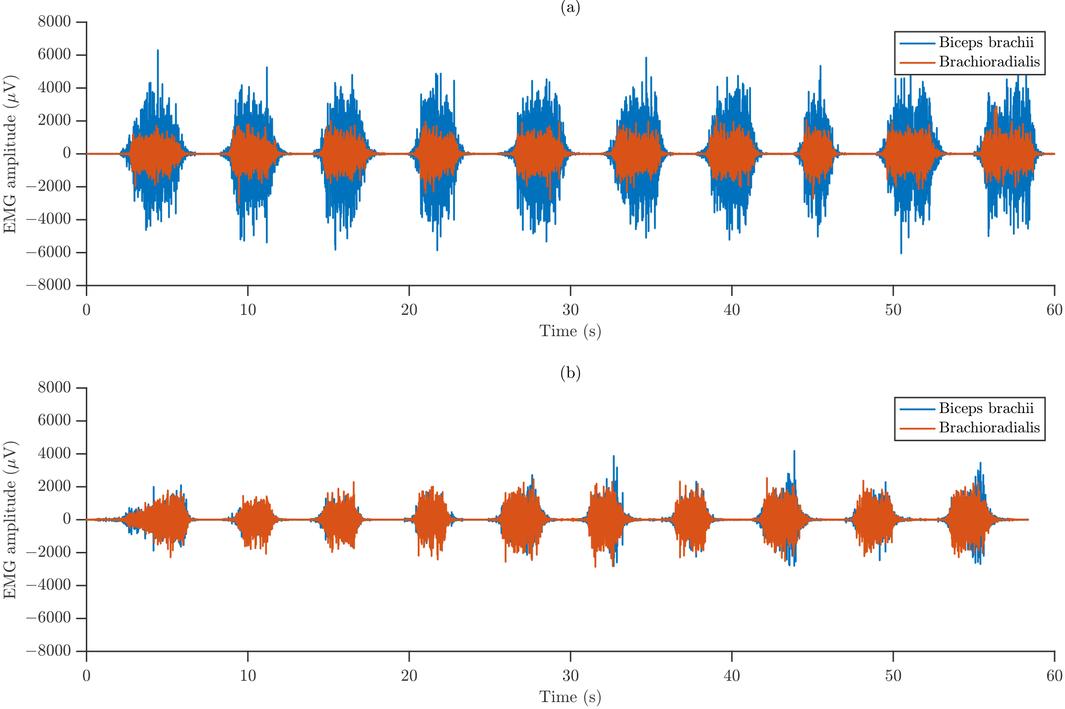 The elbow flexor muscles, particularly the biceps brachii (BB) and brachioradialis (BR), are essential for upper-limb function, contributing to tasks ranging from fine motor control to load lifting. Variations in forearm orientation have been shown to modify both the magnitude and distribution of muscle activation, reflecting the biomechanical and neuromuscular demands associated with each posture [5]. The effects of these postural changes on sEMG signals have been examined primarily through time-domain analyses, especially in studies of activation behavior and gesture-decoding performance [6]. For instance, Qing et al. [7] demonstrated that changes in forearm angle significantly affect classification accuracy, while Rumman et al. [8] introduced a dataset that explicitly incorporates multiple forearm orientations, highlighting the importance of accounting for posture-dependent variability when interpreting sEMG-based results.