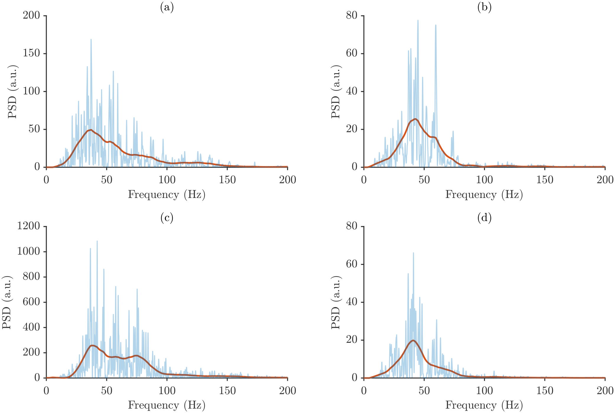 To obtain a noise-robust representation of the sEMG power spectra, smoothed power spectra were computed using a Moving Trend Filter (MTF) [30]. The MTF estimates, at each frequency bin f m , a local low-order polynomial trend of the discrete spectrum S [ m ] within a sliding window, thereby attenuating fine-scale spectral fluctuations while preserving the overall spectral shape relevant for sEMG analysis.