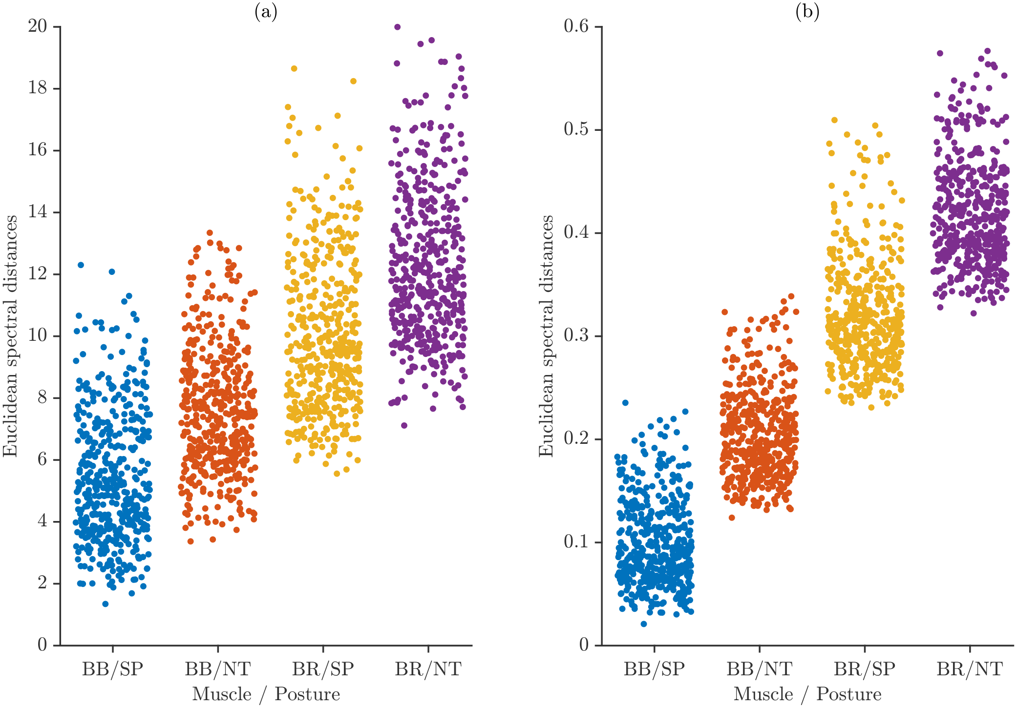 Variability was quantified in the spectral domain using the normalized power spectra obtained from each EMG activation. Since two muscles (BB and BR) were recorded under two forearm postures (SP and NT), each participant contributed four sets of power spectra corresponding to the conditions BB/SP, BB/NT, BR/SP, and BR/NT. Each set contained ten repetitions of the same isometric task, acquired under identical experimental conditions.