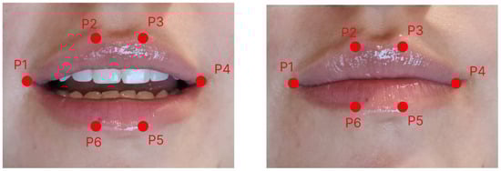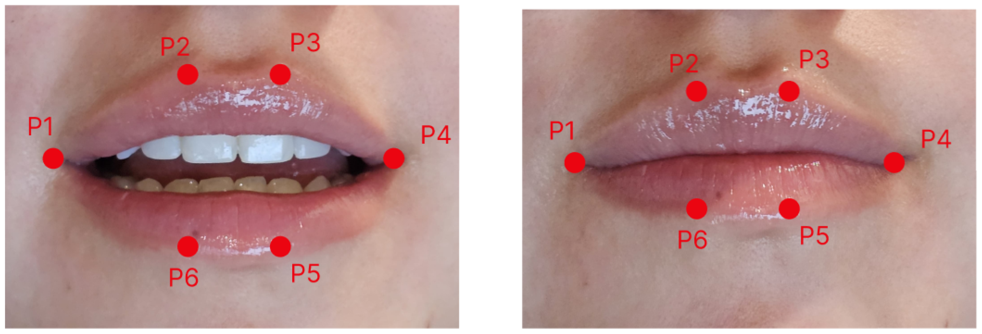 To obtain the MAR value, six specific landmarks around the mouth are needed. These landmarks include two horizontal points at the corners of the mouth and four vertical points located on the upper and lower lips. The location of the landmarks is shown on