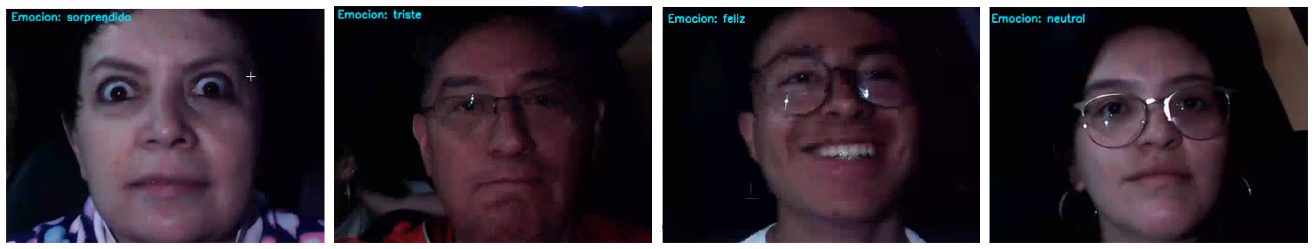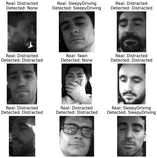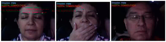 After the evaluation of the systems, the following results were obtained. For the detection of distracted driving, the system achieved 84.71% precision, while the sleepy driving detection associated with the EAR achieved 99.9% precision, and finally, yawns related to the MAR achieved 36.84% precision. The low precision in yawn detection was due to some images in which the person’s face was partially covered. Also, other problems were found with the head position of some people, provoking errors with face detection and landmarks. In