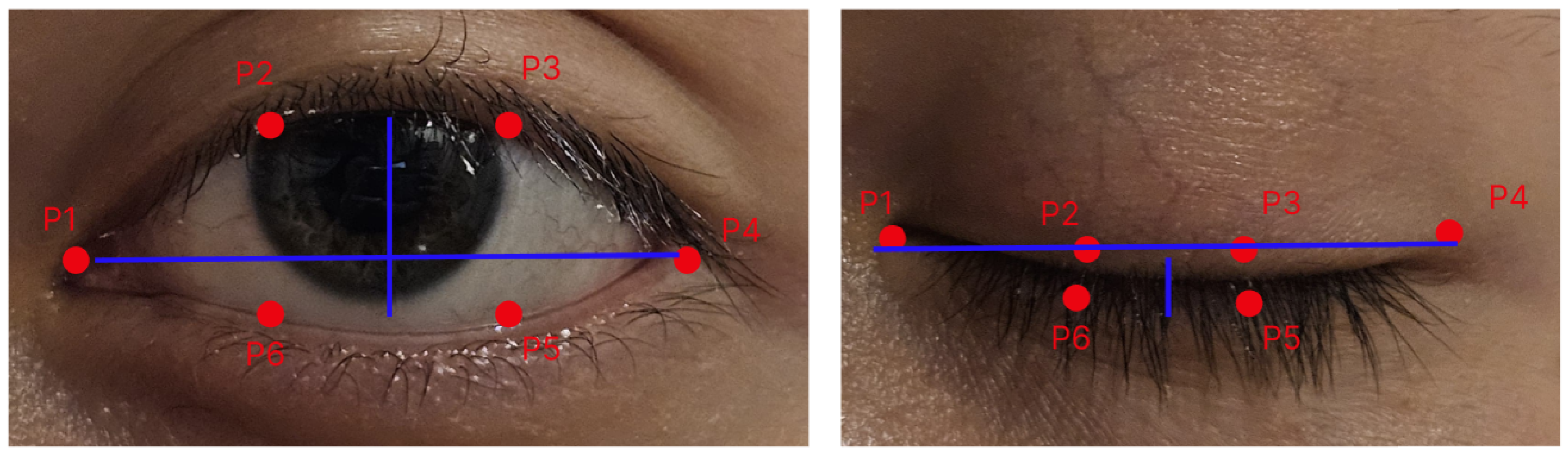 To obtain the EAR value, six specific landmarks around each eye have to be used. The landmarks needed are two horizontal points at the corners of the eyes and four vertical points positioned on the upper and lower eyelids. The locations of the landmarks are shown in