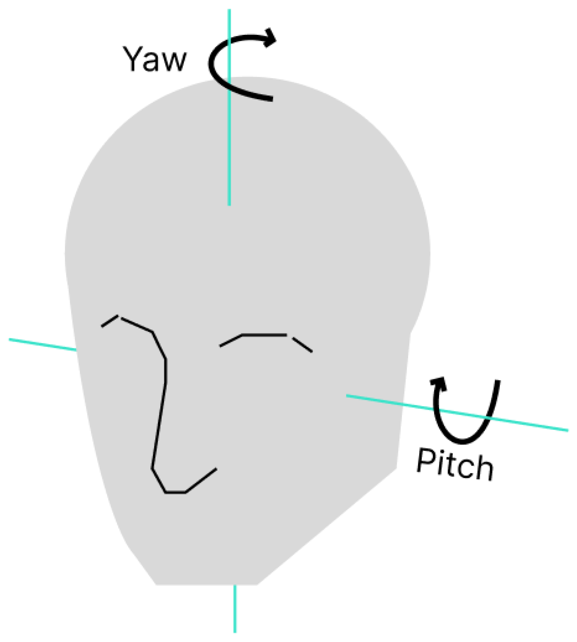 This system relies entirely on facial landmark detection to compute two parameters related to driver distraction. The first parameter is the position of the irises, which indicates whether the driver’s gaze is directed toward the road or diverted toward other objects. Gaze diversion is one of the most common causes of traffic accidents. The second parameter is the inclination of the head, mainly along two axes, known as pitch and yaw [