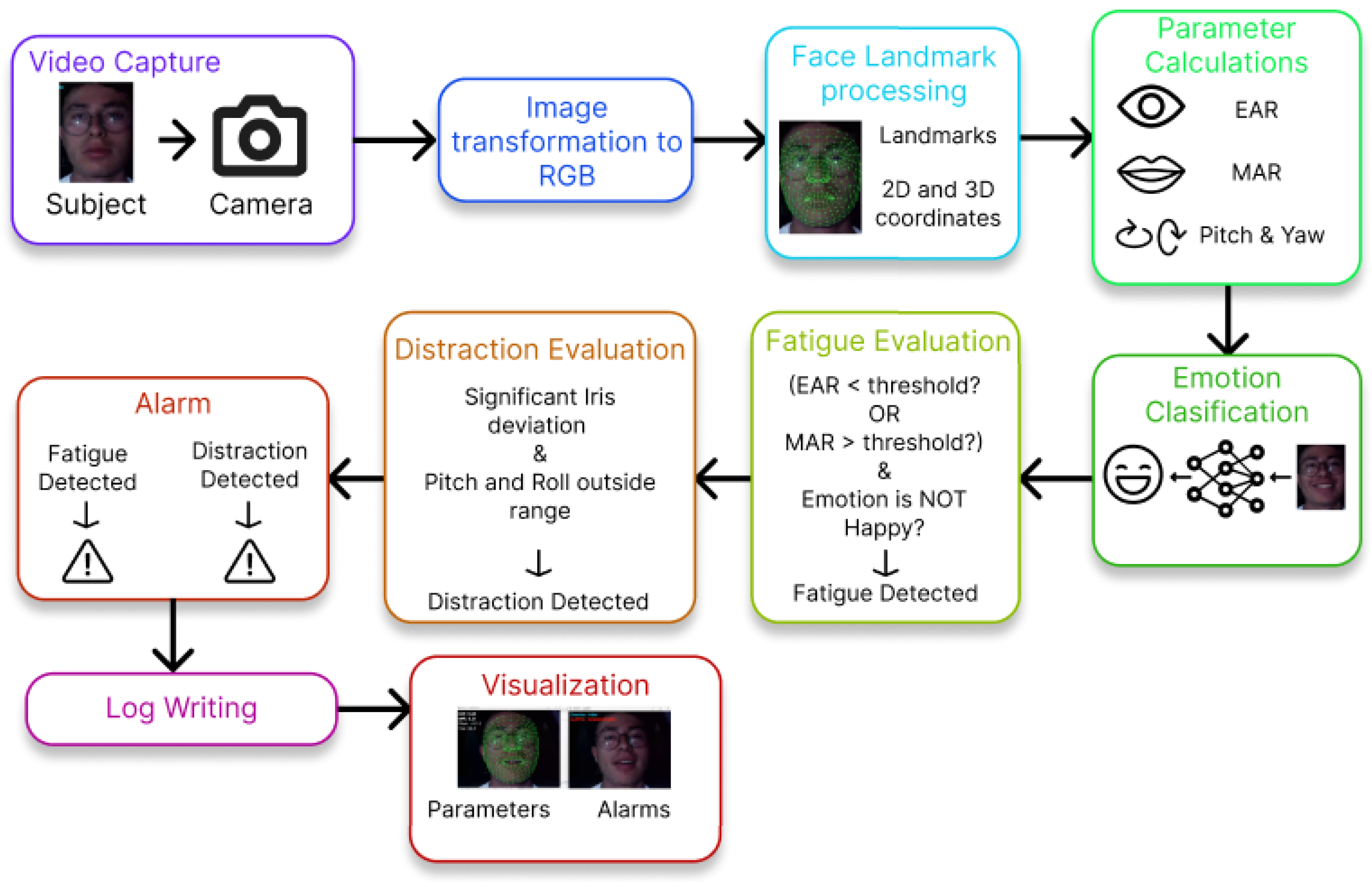 The system was developed in a Python 3.10 script that provides the drowsiness, distraction and emotion detection using the real-time video capture of a subject. To implement all of these detection functionalities, two major modules were included in the system design: a trained CNN for emotion detection and a pre-trained face landmark detection model necessary for the calculations of drowsiness and distraction parameters.