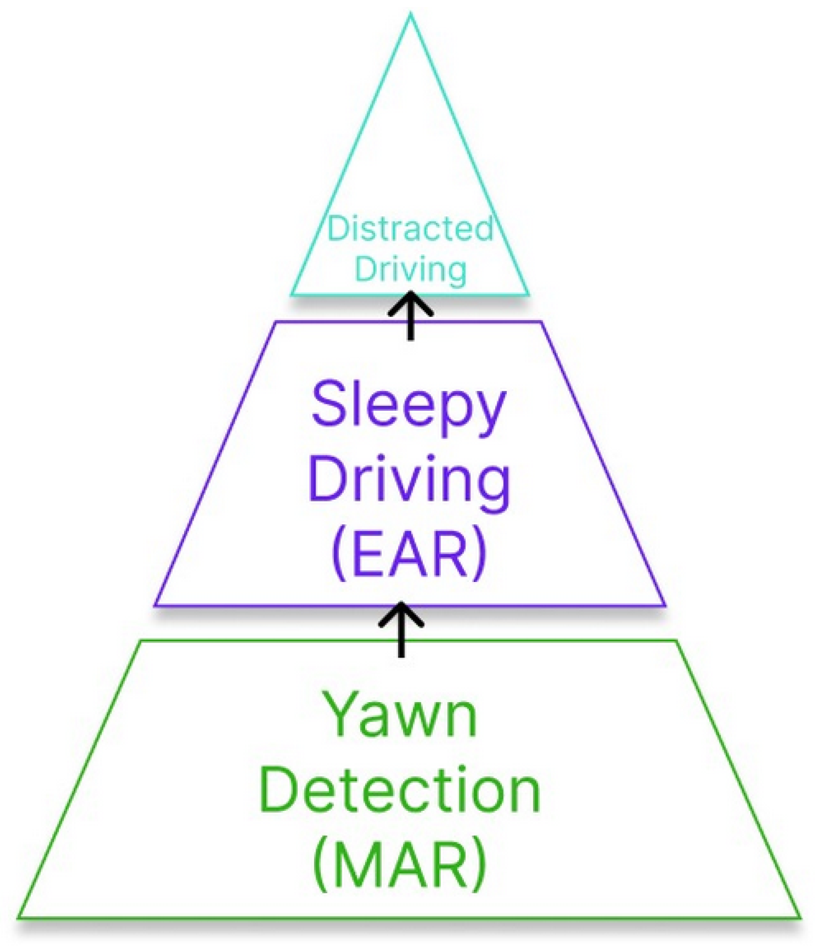 11] with the classes distracted driving, sleepy driving and yawning. Each category helped test the accuracy of the distraction detection, the EAR and the MAR for drowsiness detection. Every picture went through the system, with yawn detection evaluated first and sleepy driving next, and at the end, distracted driving was evaluated. With this order, false positives are avoided in pictures. The hierarchy is shown in