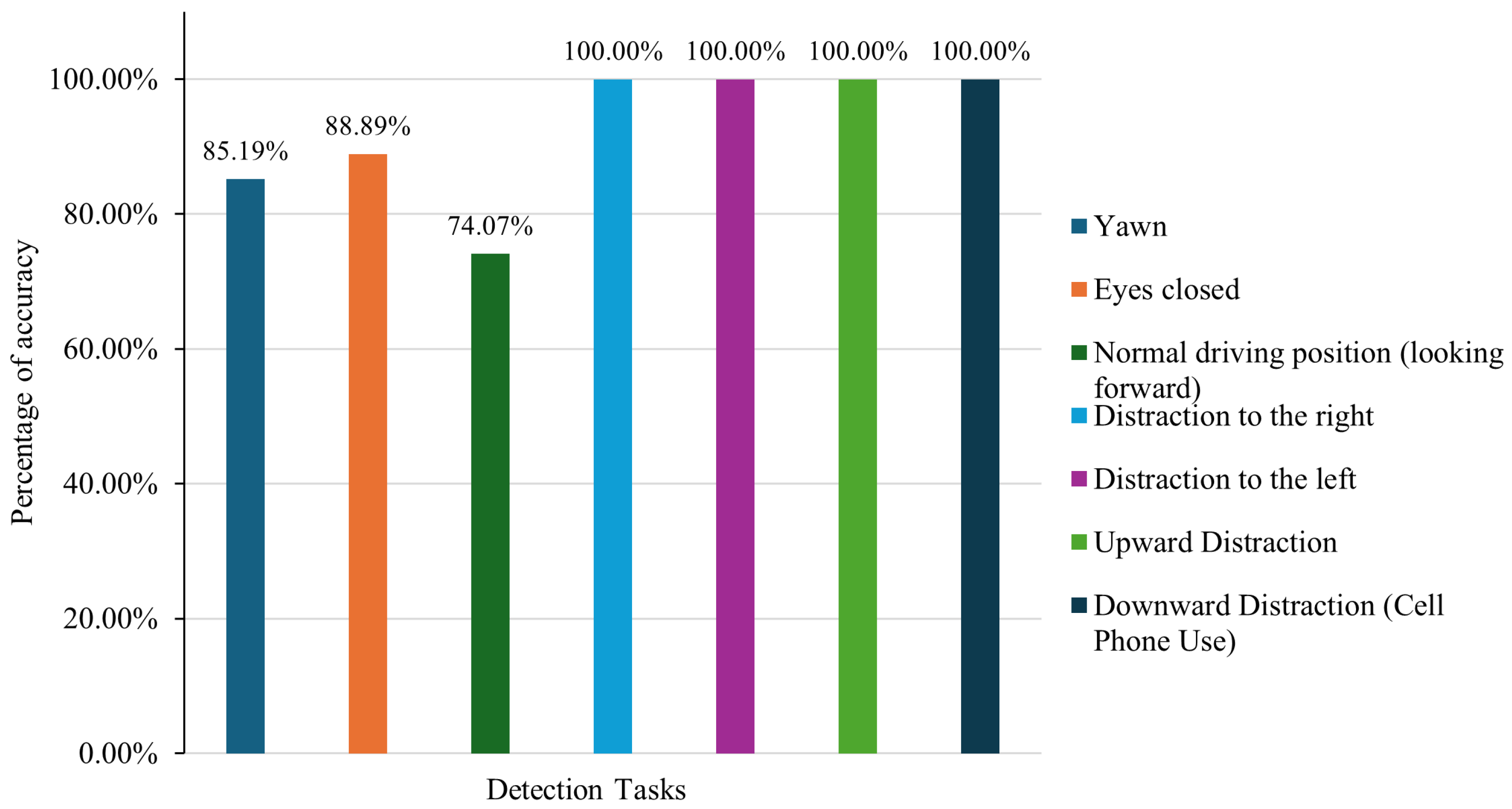 Figure 12 presents the detection accuracy achieved by a driver monitoring system across several tasks aimed at identifying drowsiness and distraction in drivers. In general, the findings underscore the system’s high efficacy in recognizing distraction-related behaviors. All cases involving gaze deviation—whether directed to the right, left, upward, or downward—achieved a perfect detection rate of 100%, demonstrating the reliability of the algorithm’s yaw, pitch, and iris deviation computations.