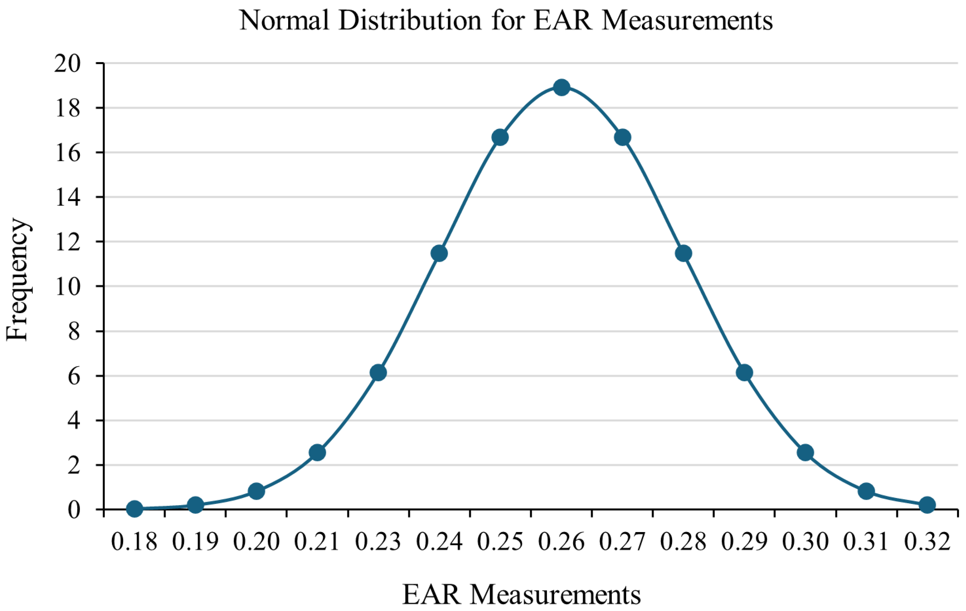 Figure 13, the data followed a normal distribution with a mean EAR of 0.2570 and a standard deviation of 0.02109. This indicates that, under normal conditions, EAR values are generally stable between individuals, even though some differences due to facial structure are expected.