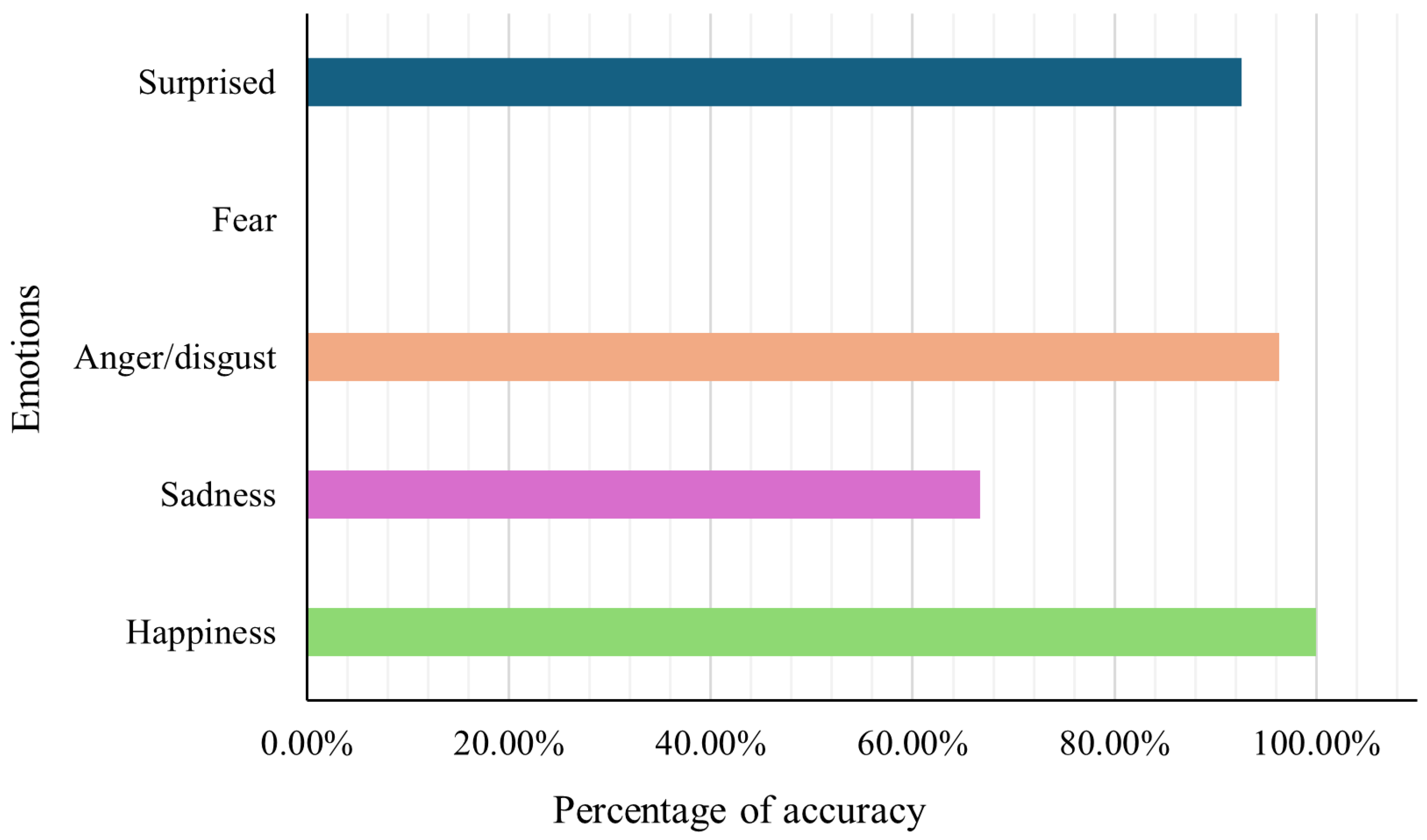 Figure 14 shows how well the emotion detection system worked in both real and simulated driving scenarios. The system did especially well at recognizing happiness (100%), anger/disgust (96.3%), and surprise (92.6%). These emotions tend to show up clearly on people’s faces, which likely helped the system identify them more accurately.