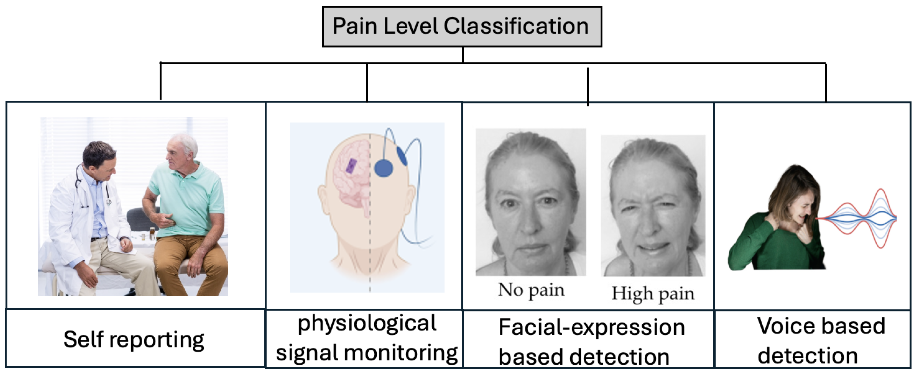 3]. To address this limitation, researchers have explored several pain level classification techniques, which can be broadly categorized into four types, as shown in