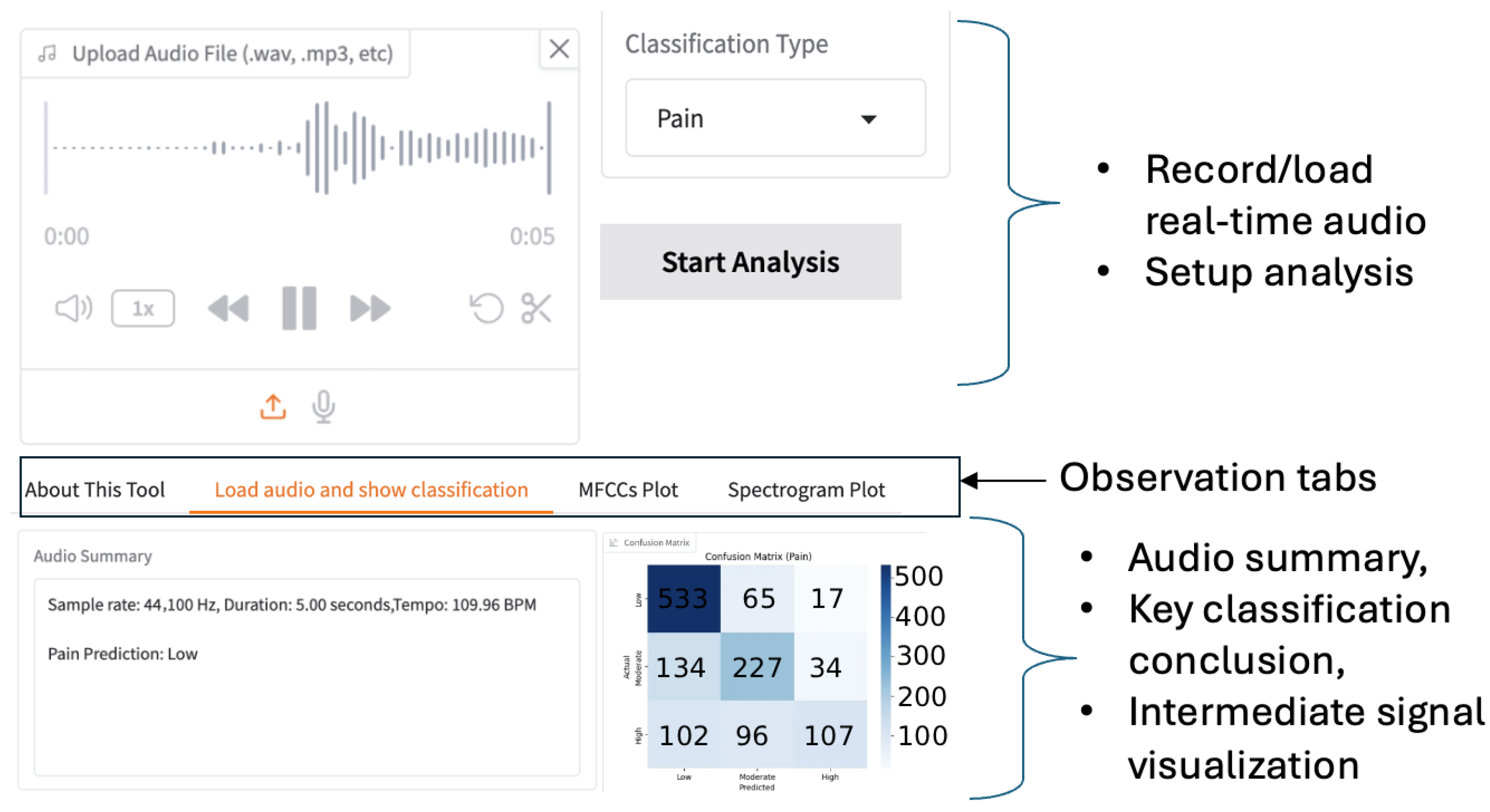 Figure 6. Based on the classification objective, the control panel guides users in selecting the most appropriate trained CNN model. For batch testing with multiple audio files, the system visualizes performance using a confusion matrix. For a single audio file, the tool outputs the predicted pain level directly. By visualizing spectral features, we enhance interpretability and speed up the optimization of CNN models.