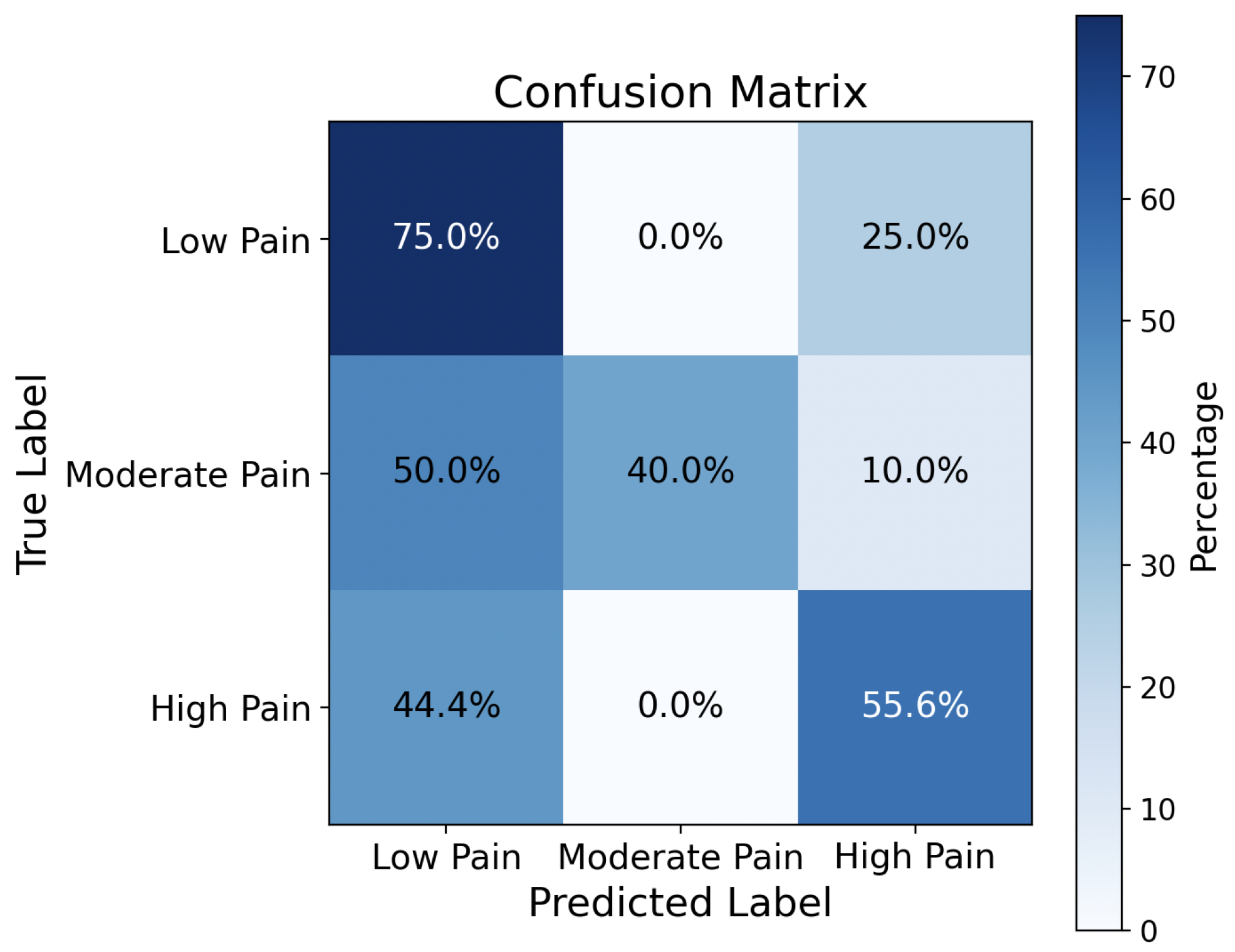 Table 3. We used those samples to train a CNN model and created a balanced sample set for accuracy testing. When high pain cases dominate the training samples, the model overwhelmingly predicts high pain, regardless of the true label. The low and moderate pain levels are almost entirely incorrectly classified as high. These observations indicate that the model overfits to the dominant label and fails to learn relevant features for the non-dominant labels. Thus, the classification model tends to favor low-pain predictions, as shown by the cluster in the leftmost bar chart in