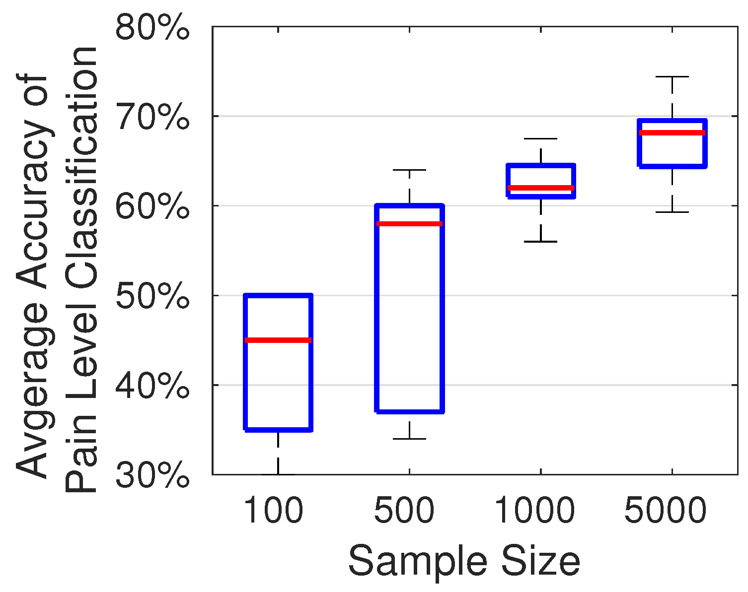 The accuracy of pain level classification depends on the number of samples used in training the CNN model. To quantitatively assess the impact of the number of training samples on accuracy, we randomly selected subsets of 100, 500, 1000, and 5000 audio samples from the TAME pain dataset. For each subset, the proportions of low, moderate, and high pain samples were maintained in accordance with their distribution in the full TAME pain dataset. As shown in
