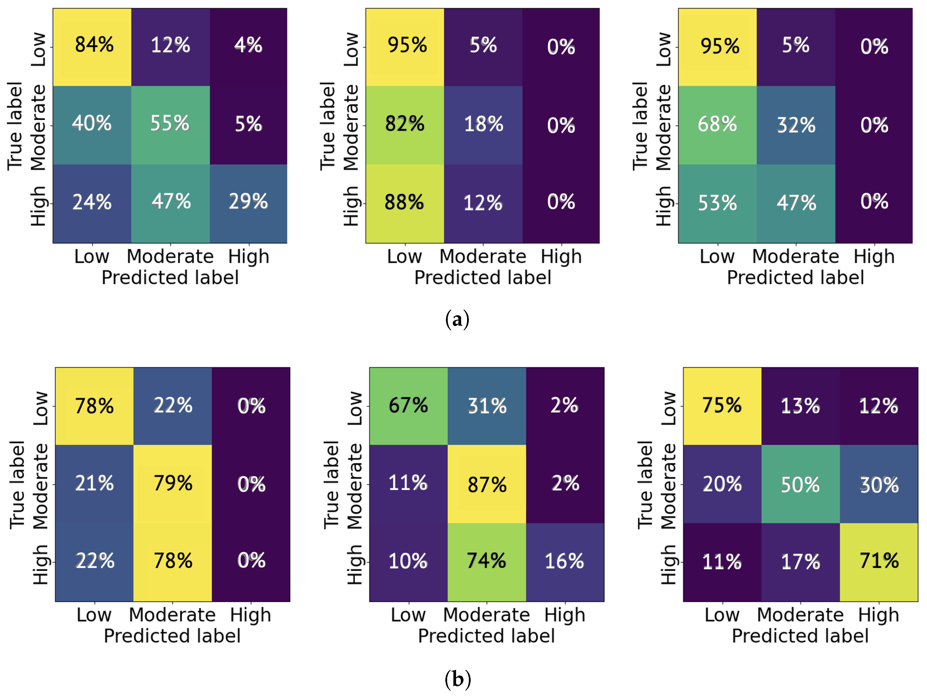 Figure 12a, the CNN model tends to classify the pain level as low more significantly than moderate and high, and the high pain level is rarely labeled. This indicates a conservative tendency in the model’s pain level estimation. The likely cause of this behavior is the class imbalance in the selected 1000 samples from the TAME pain dataset, where low-pain samples constitute the majority. When using 5000 samples, the trained CNN model achieved an improved accuracy in classifying high-level pain. For instance, as shown in
