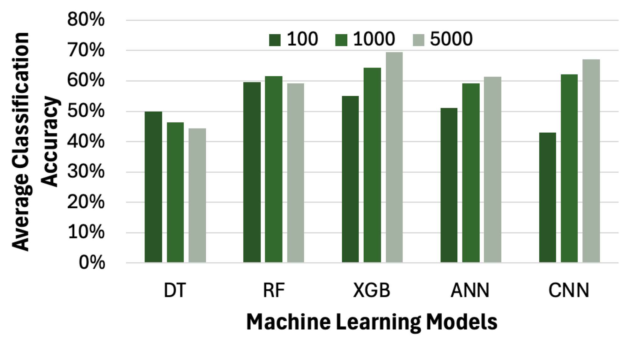 Since different machine learning models yield varying levels of accuracy in pain level classification, we extend our framework to incorporate several algorithms, including ANN, XGB, RF, and DT. Due to the significantly long training times of certain models, we limit our experiments to datasets with no more than 5000 samples in this subsection. As shown in