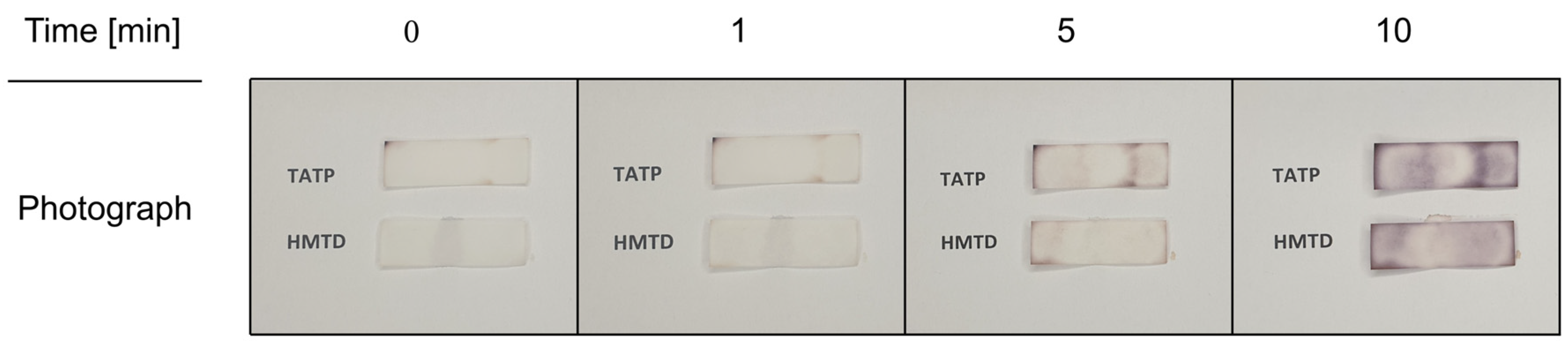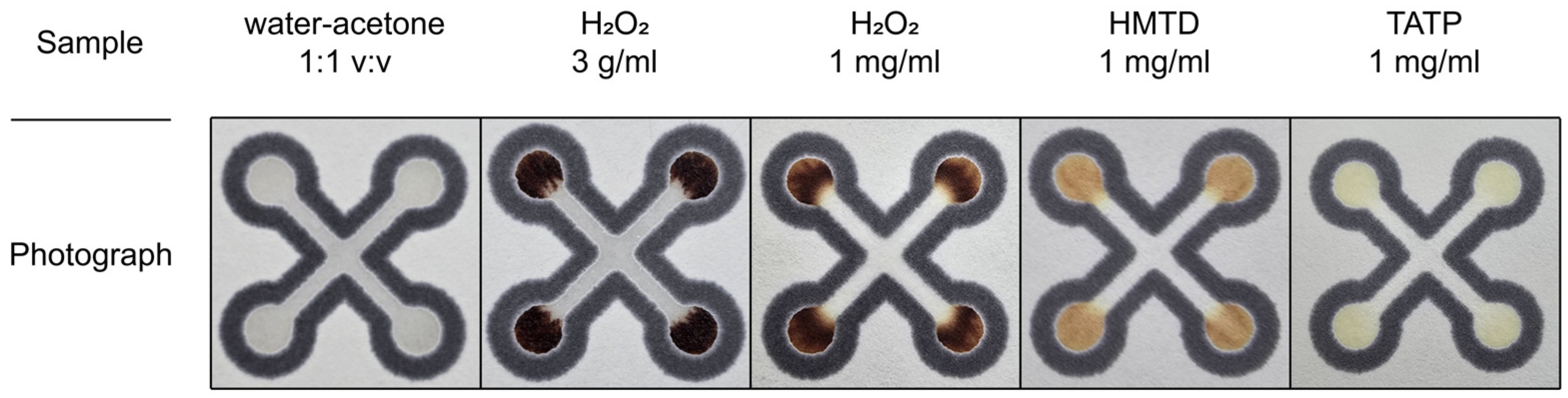 - Schulte-Ladbeck, R.; Kolla, P.; Karst, U. A field test for the detection of peroxide-based explosives. Analyst 2002, 127, 1152–1154. [Google Scholar] [CrossRef]