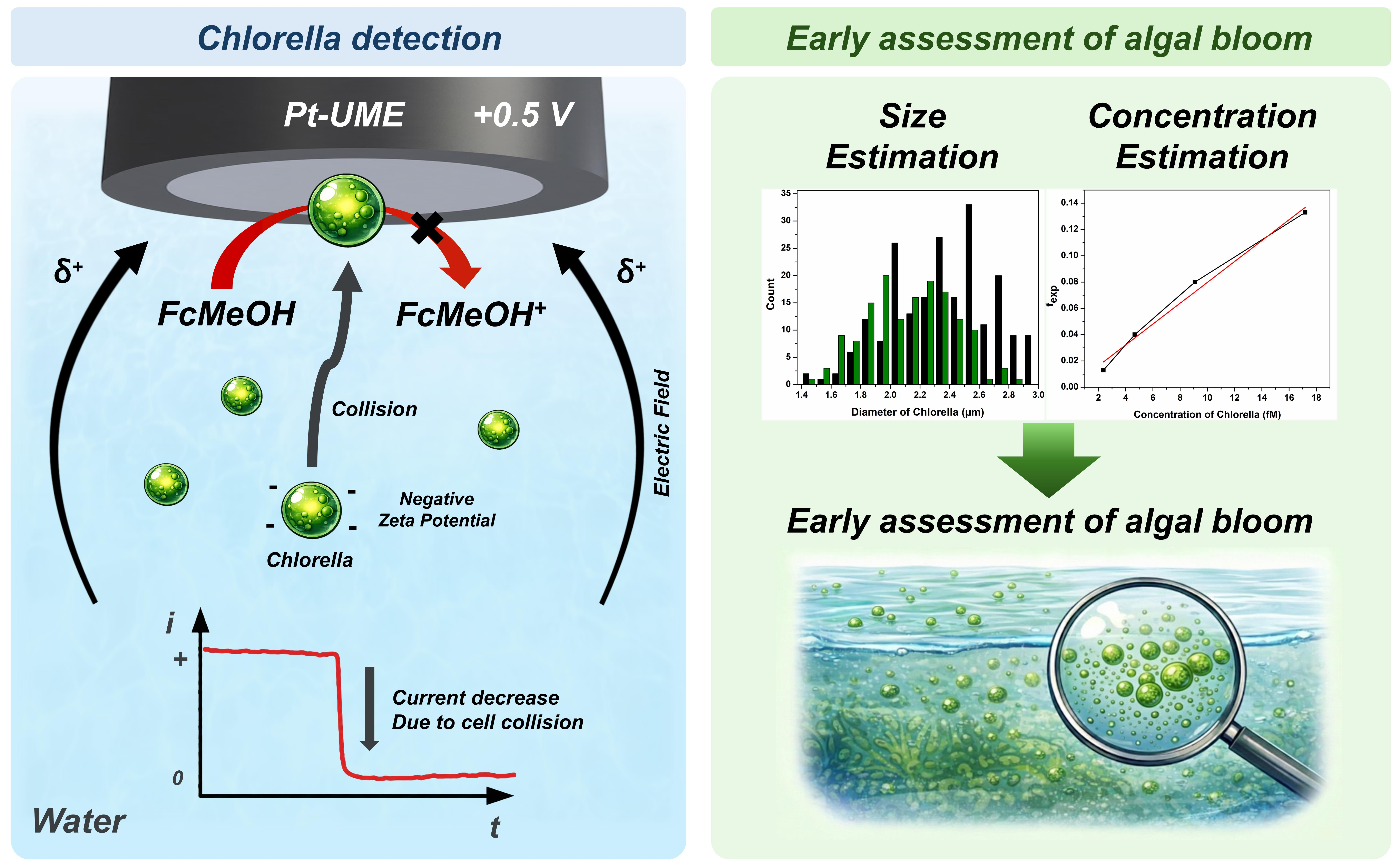 Consequently, the detection of Chlorella was achieved in this study by applying the single-particle collision method to analyze the abrupt current fluctuations arising from particle–electrode collisions. Furthermore, specific electrolyte conditions that induce migration were employed to enhance the collision frequency, thereby improving detection sensitivity. The size of colliding Chlorella was estimated via COMSOL Multiphysics simulations by matching the measured current changes. The collision frequency as a function of cell concentration was also investigated. This methodology enables real-time detection of Chlorella in aqueous environments without the need for pretreatment. Ultimately, it may serve as a monitoring platform for early assessment of algal bloom progression by estimating both the size and concentration of the algal cells.