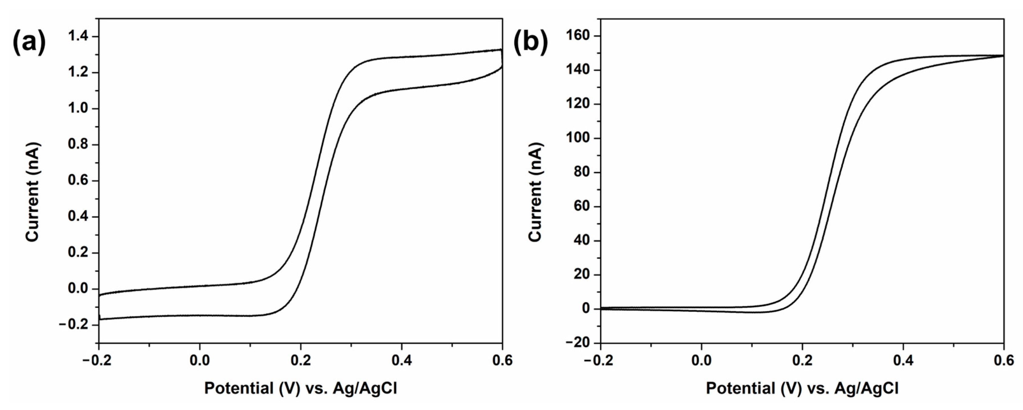 Figure 1 presents the cyclic voltammograms (CVs) for both redox species. As shown in