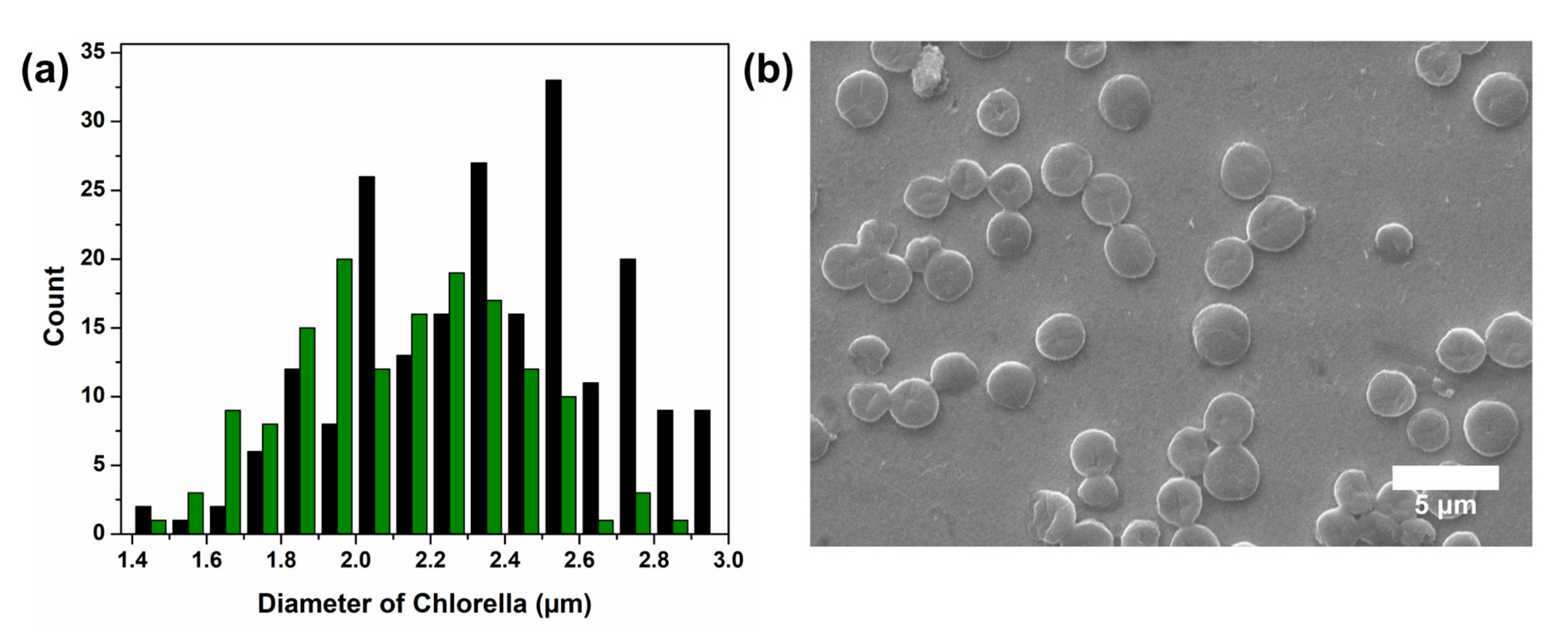 Chlorella cells, revealing a flattened circular morphology. The cells may appear somewhat flattened relative to their hydrated state because the samples were dried for more than 24 h prior to imaging. The drying process may also contribute to underestimation of