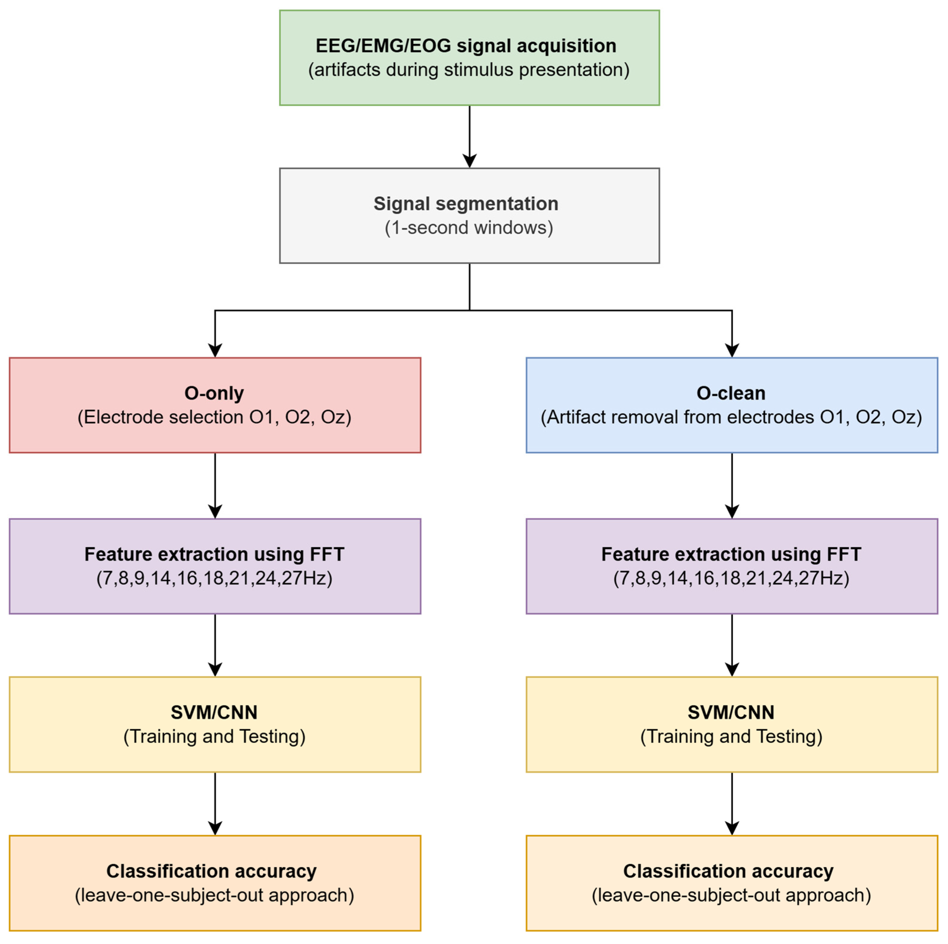 In both pipelines, feature extraction was performed using the fast Fourier transform (FFT), analyzing amplitudes in frequency bands corresponding to the stimulation frequencies and their harmonics (7, 8, 9, 14, 16, 18, 21, 24, and 27 Hz). The extracted features were subsequently used for classification with SVM and CNN algorithms, employing a leave-one-subject-out approach to assess generalized performance. The study design is based on a direct comparison of classification results obtained from the O-only and O-clean pipelines, enabling quantitative assessment of the impact of artifact reduction on SSVEP recognition performance. In addition, the analysis includes a search for optimal combinations of auxiliary channels that yield the greatest improvement in classification accuracy, allowing recommendations for a minimal yet effective electrode set for practical BCI applications. In summary, the objectives of this work are to: