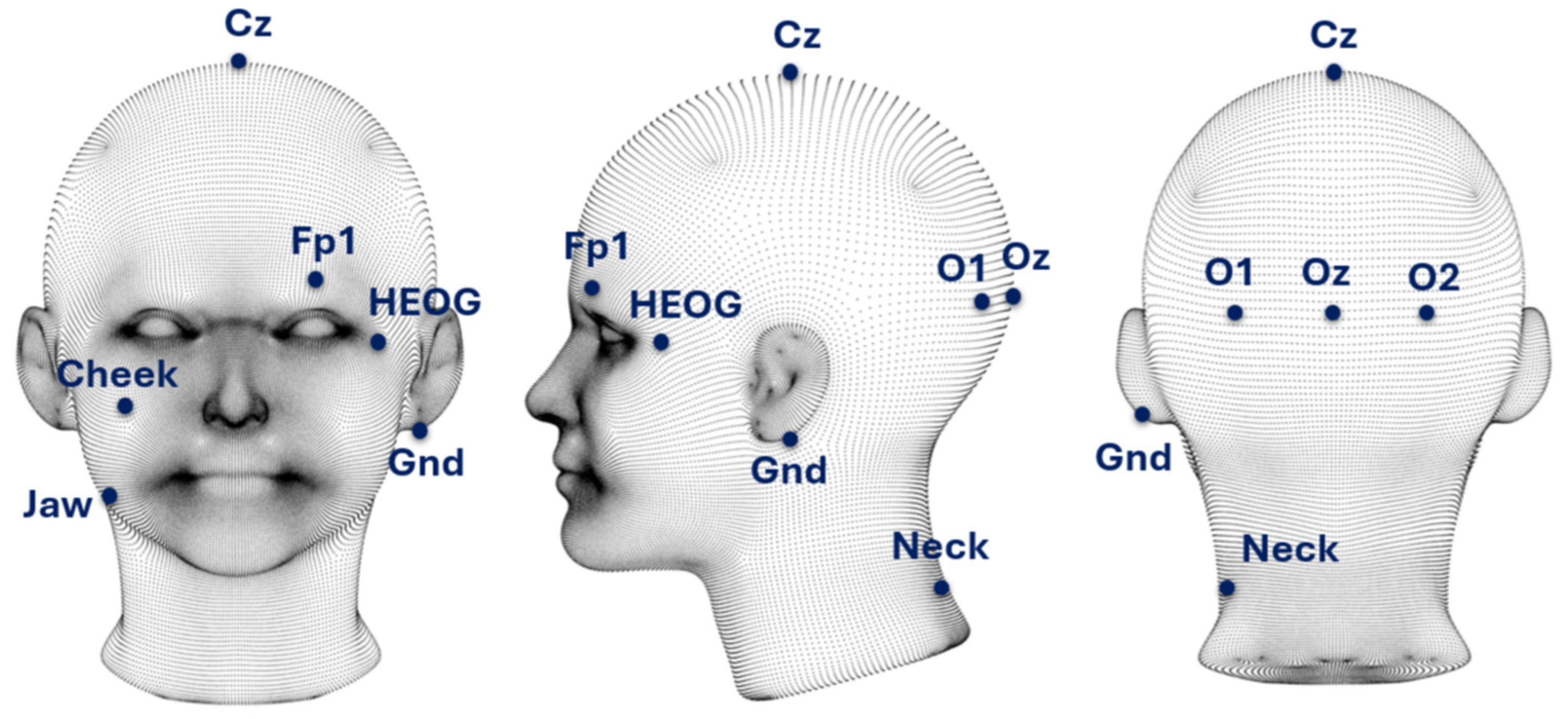 10]. Despite growing interest in auxiliary electrodes, systematic analyses of their individual contributions—particularly muscular channels placed on the cheeks, jaw, or neck—remain scarce. Moreover, many studies rely on experimental protocols that suppress natural movements, limiting ecological validity [