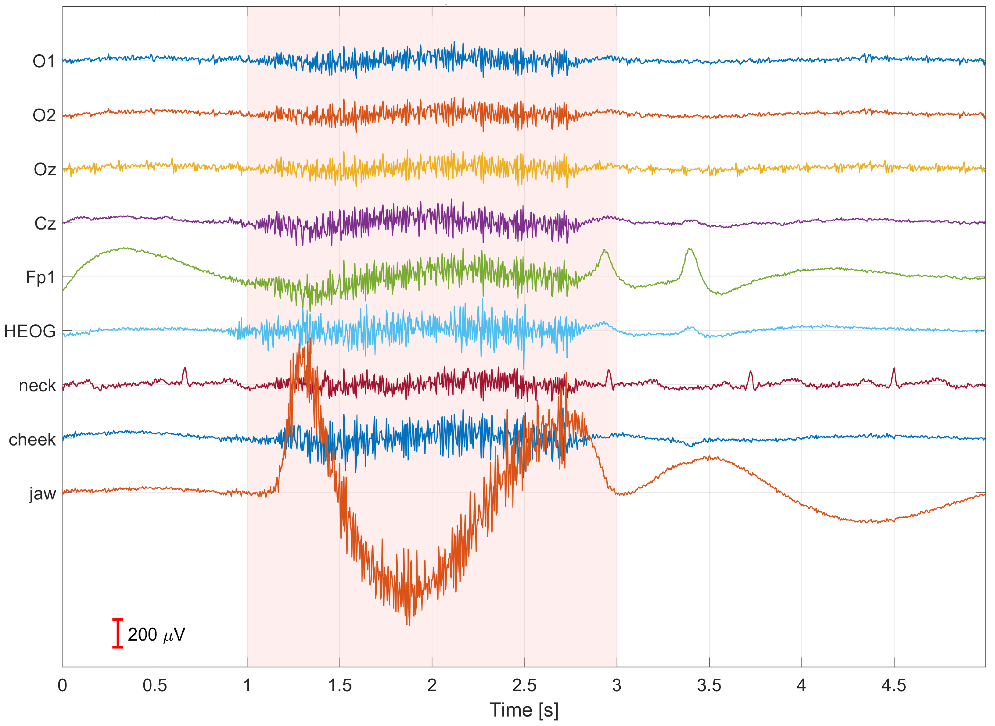 Figure 4 presents an example of a 5-s segment of signals recorded from participant S01 during 9 Hz visual stimulation while intentionally performing artifacts. The figure shows the time courses of bioelectrical signals recorded under conditions of motion- and muscle-related interference. Artifact occurrences are marked in red, allowing for unambiguous identification of their temporal locations and assessment of their impact on the analyzed signal. The recorded EEG signals are publicly available in the database A Database of EEG and EMG SSVEP Recordings for Artifact Analysis and Removal (