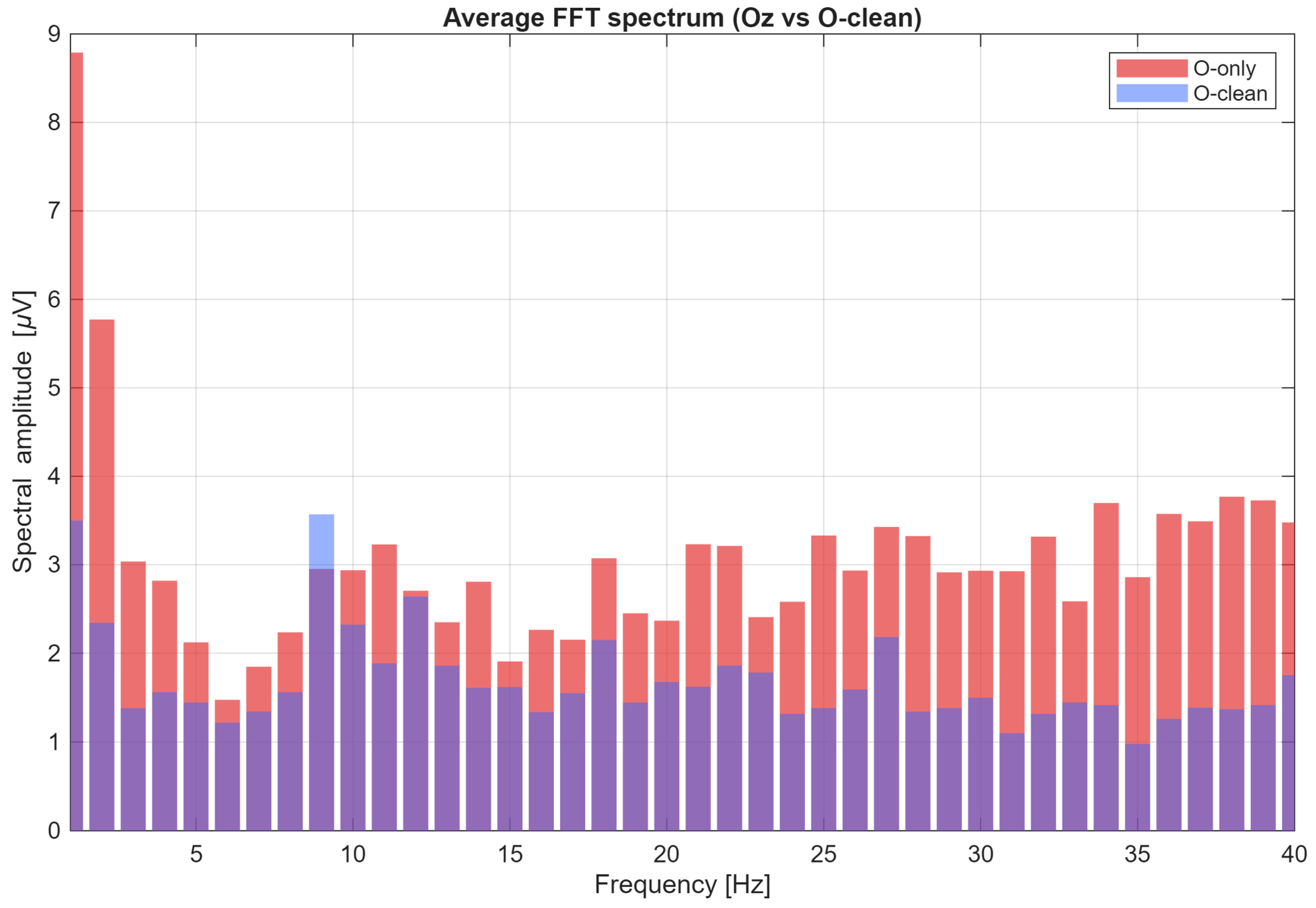 Figure 8 presents the averaged FFT amplitude spectrum of the EEG signal from the Oz electrode in the 1–40 Hz range during 9 Hz visual stimulation, comparing signals before artifact removal (O-only) and after cleaning (O-clean). The spectrum prior to cleaning exhibits elevated amplitude levels across a broad frequency range, reflecting substantial contamination by artifact-related components. After applying the cleaning procedure, a pronounced reduction in mean amplitude is observed throughout the analyzed band, while the spectral component corresponding to the 9 Hz stimulation frequency remains clearly preserved. This result confirms the effectiveness of the proposed method in suppressing artifacts while retaining information that is essential for SSVEP analysis. The application of linear regression with auxiliary channels enabled effective reduction in non-physiological interference, resulting in improved EEG signal quality and increased reliability of SSVEP classification. The obtained results clearly confirm the validity of signal cleaning in BCI systems, as it led to an average accuracy improvement of approximately 9–10 percentage points, which can substantially enhance the practical reliability of brain–computer interfaces.