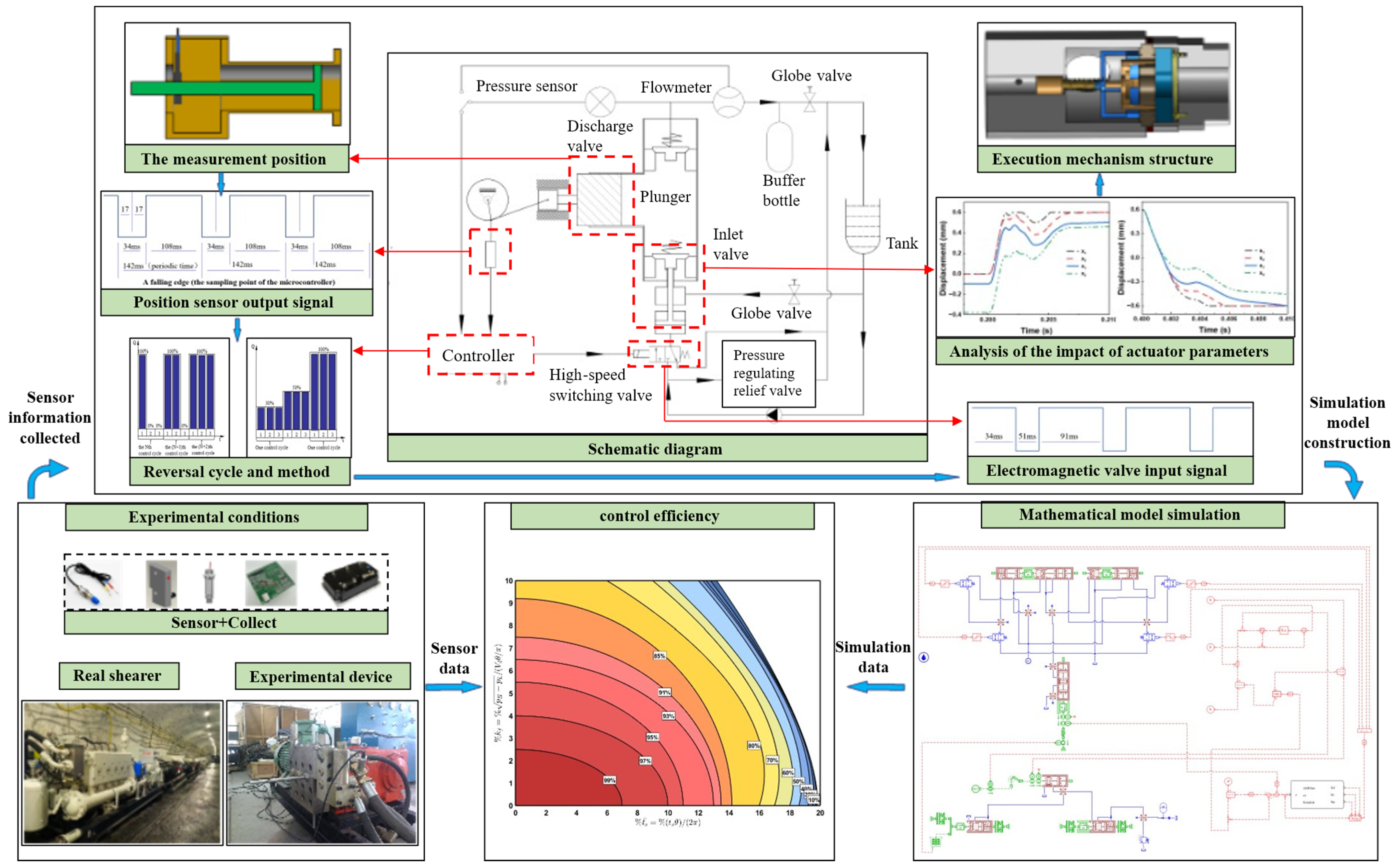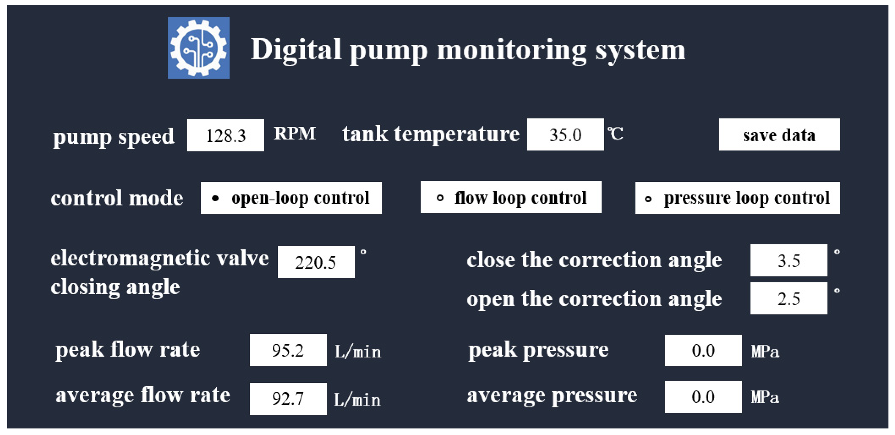 - Within an experimental setup, this study established a digital pump measurement and control system utilizing a conventional plunger pump and a newly designed actuator prototype as the physical entity. The system enables real-time monitoring of parameters such as plunger displacement, discharge pressure, and flow rate, effectively mitigating the challenges of non-adjustable displacement in fixed-displacement pumps and energy wastage due to relief valve overflow. By comparing the displacement regulation performance of the digital pump prototype under varying operational conditions and examining the interrelationship among digital valve response time, fluid action area, and system efficiency, the feasibility of the proposed digital distribution methodology was empirically validated.