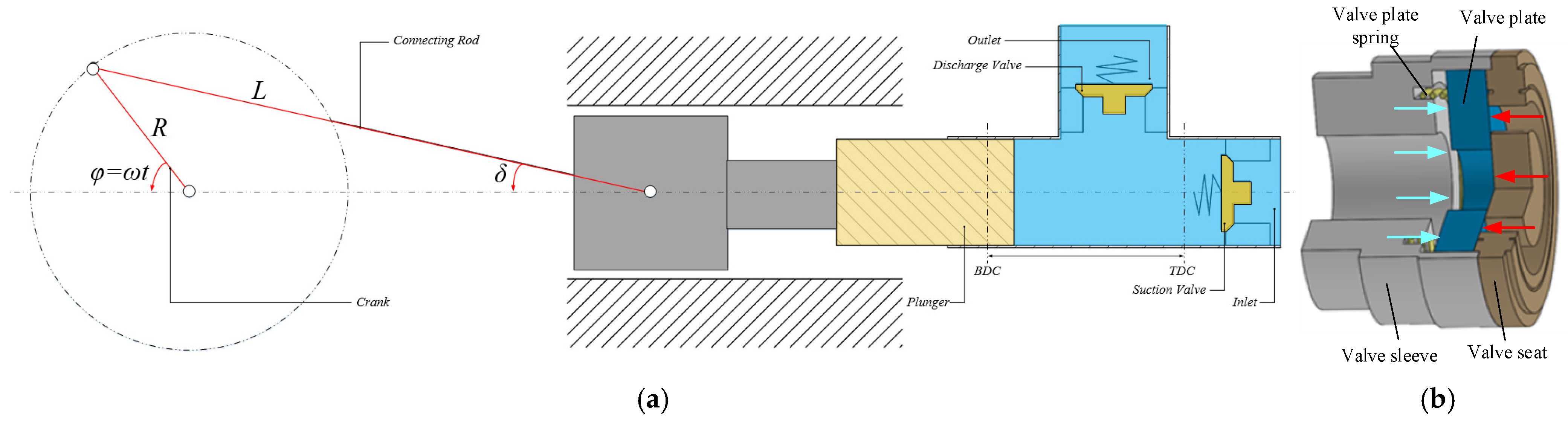 - Wang, T.; Wang, G.; Dai, L.; Chen, L.; Qiu, S.; Li, R. Motion mechanism study on the valve disc of an ultra-high pressure reciprocating pump. Mech. Syst. Signal Process. 2021, 160, 107942. [Google Scholar] [CrossRef]