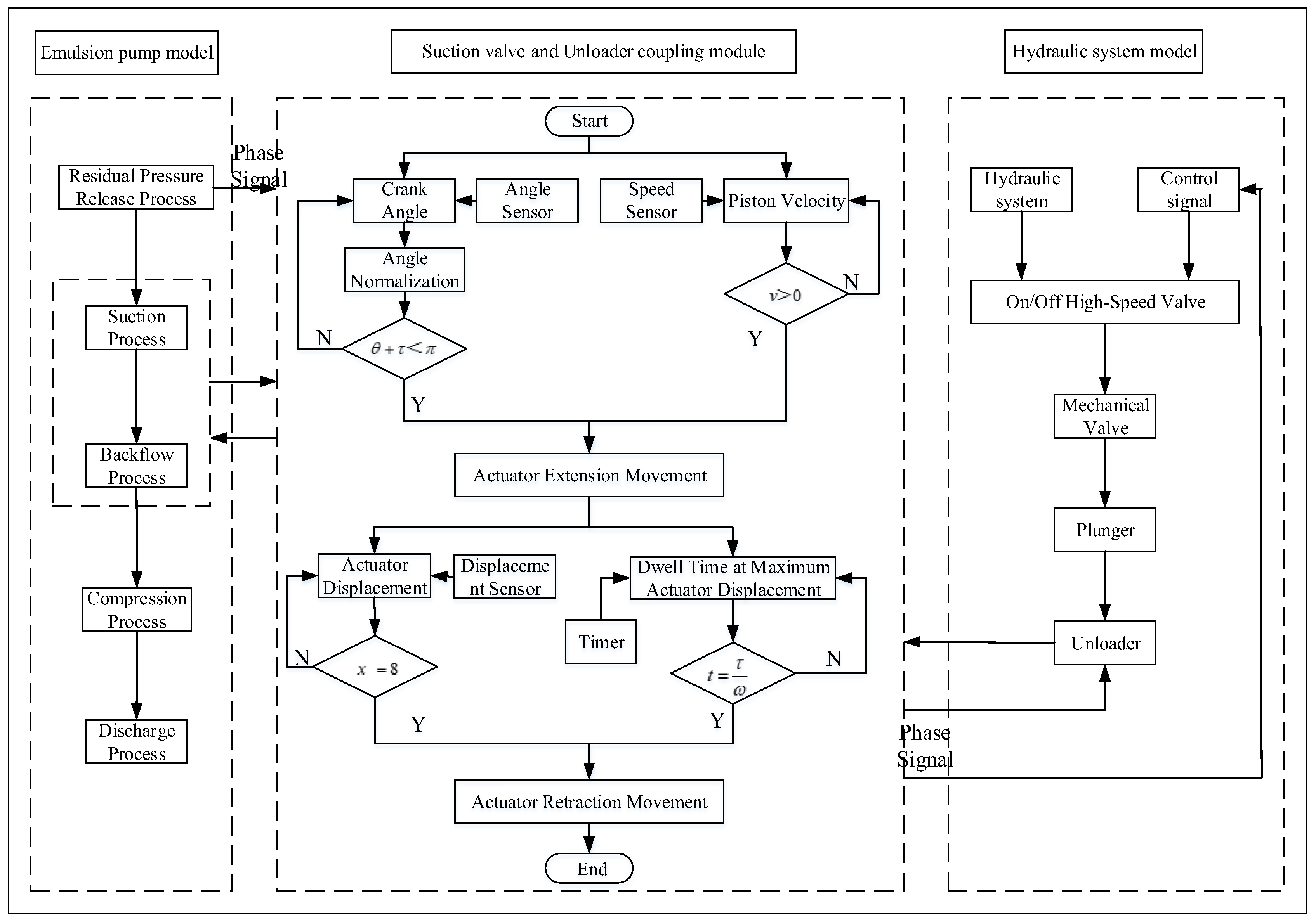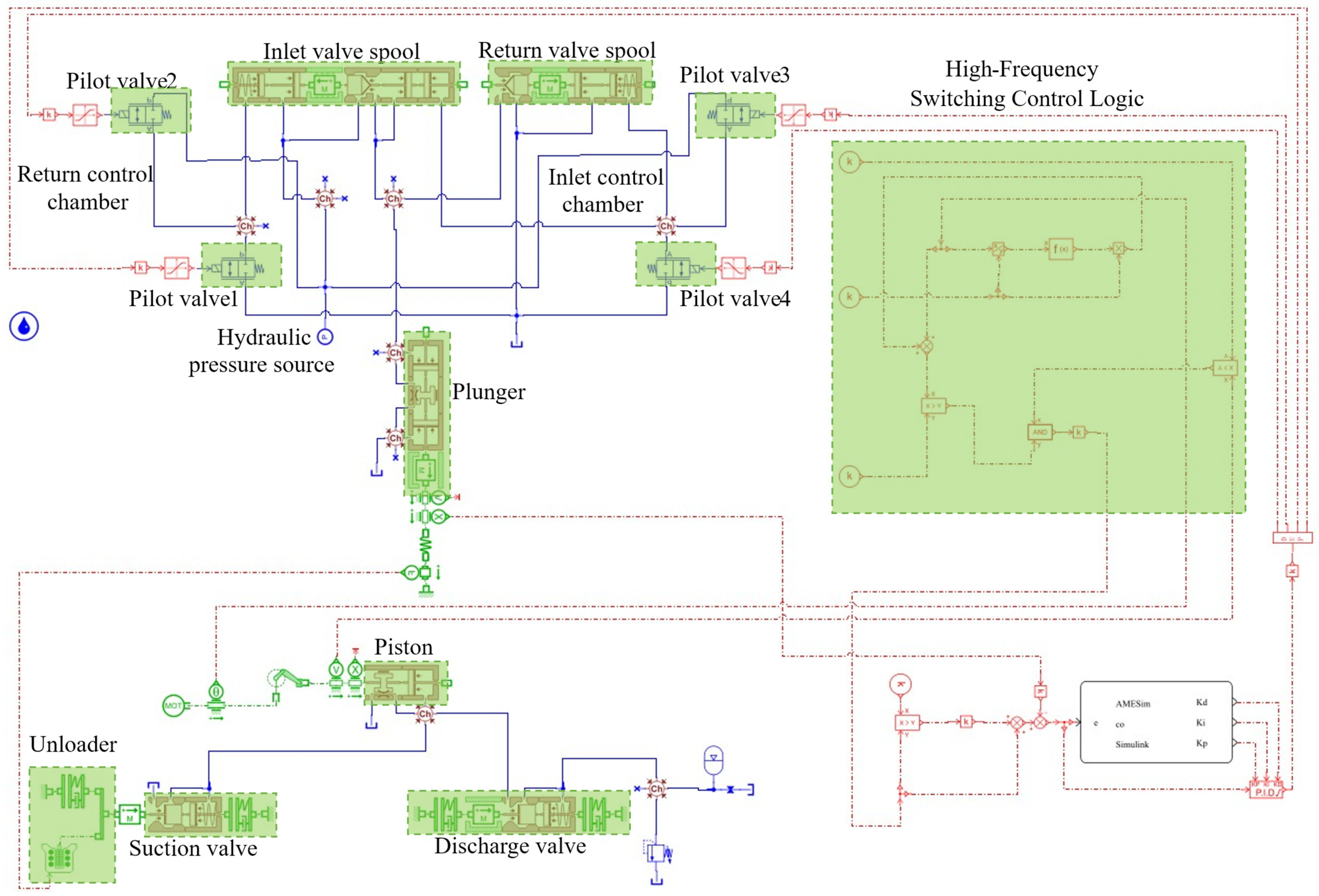 - The principal functions and technical specifications of the digital distribution system were analyzed and computed. A high-flow high-speed switching valve and its associated controller were deployed to achieve digital regulation of the effective displacement of the plunger pump, culminating in the conceptual design of the system and thereby enabling variable displacement control of the fixed-displacement pump. Plunger position is detected and ascertained via a Hall effect sensor. When the plunger of the single-cylinder pump initiates its descent from top dead center, the controller energizes the pilot solenoid valve. High-pressure fluid from the pilot supply pump traverses the pilot valve into the piston chamber of the high-flow solenoid valve, actuating the push rod to open the plunger pump’s inlet valve, thereby permitting fluid intake into the plunger chamber. As the plunger ascends from bottom dead center, the pilot-operated high-flow switching valve remains open, and the fluid pressurized by the plunger recirculates to the inlet side via the inlet valve. When fluid delivery to the high-pressure chamber is required, the controller de-energizes the pilot valve. The inlet valve closes, and the outlet valve opens correspondingly, enabling fluid discharge into the high-pressure pipeline. Throughout the plunger’s compression stroke, precise displacement control is accomplished by adjusting the de-energization timing of the pilot-operated high-flow high-speed switching valve. Once the main valve piston chamber is replenished with low-pressure fluid, the piston resets to bottom dead center under spring force. At this stage, the pilot solenoid valve deactivates, and the pump reverts to operation based on mechanical distribution principles.