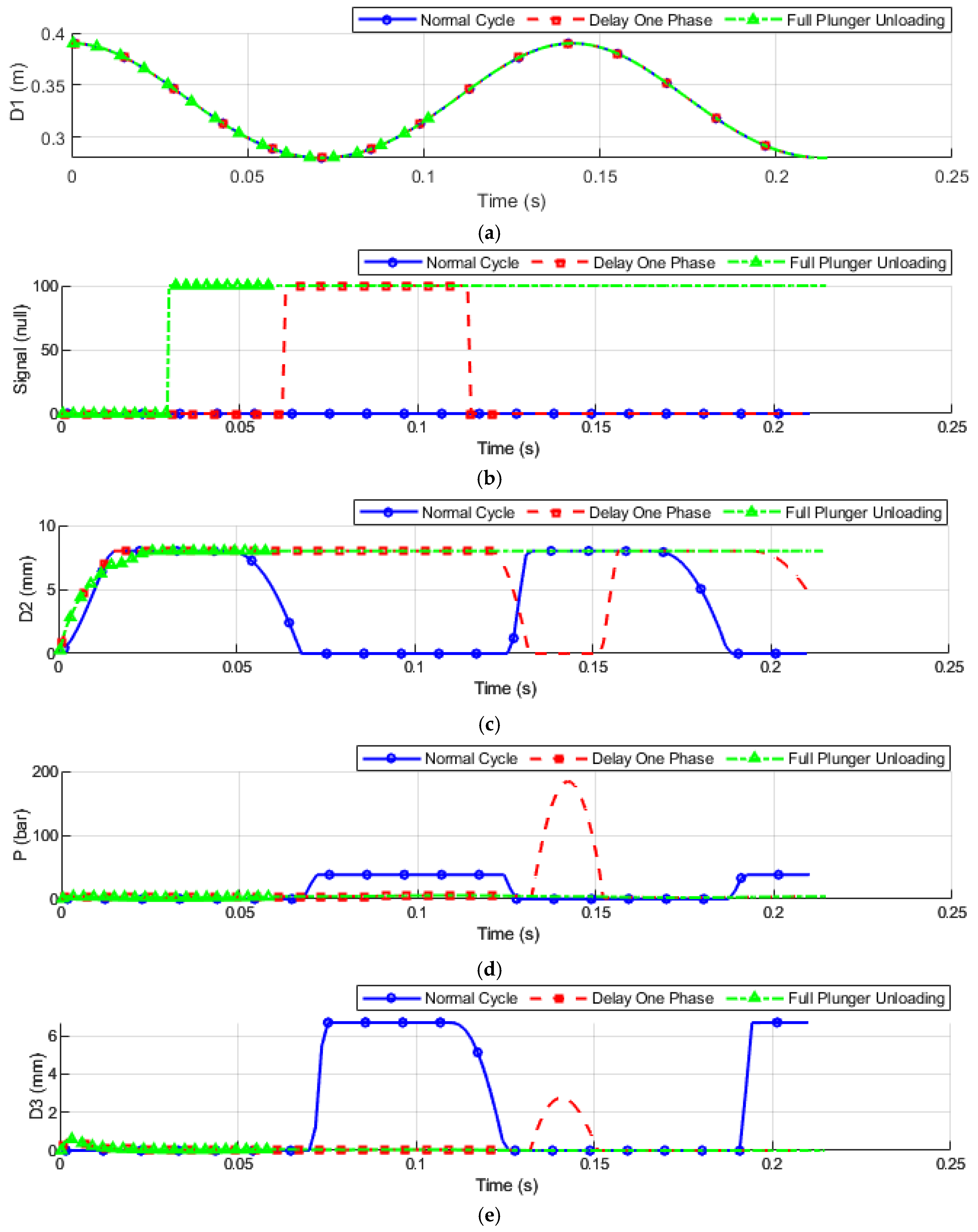 - Focusing on the newly integrated actuator within the digital distribution system, this research entailed structural design and parametric analysis, and proposed a multi-mode composite reflux regulation strategy in accordance with actual fluid usage conditions and operational characteristics. During the actuator’s structural design phase, the influence of critical parameters—such as piston diameter and spring stiffness—on its dynamic behavior was ascertained. Subsequently, a systematic investigation was conducted into the mechanism by which dynamic parameters, including opening force and displacement, affect the response characteristics of the suction valve during opening and closing sequences. Ultimately, grounded in multi-objective optimization theory, a composite regulation strategy was formulated, integrating single-cycle uniform loading, dual-cycle differential loading, multi-cycle full-plunger operation, and adjustable duty cycle control. Focusing on the newly introduced actuator in the digital distribution system, this study carried out structural design and parameter analysis, and proposed a multi-mode composite reflux regulation strategy in combination with actual fluid usage conditions and operational characteristics. During the structural design phase of the actuator, the influence of key parameters such as piston diameter and spring stiffness on its motion behavior was clarified. Subsequently, a systematic analysis was conducted on the mechanism through which dynamic parameters—such as the opening force and displacement—affect the response characteristics of the suction valve during opening and closing. Finally, based on multi-objective optimization theory, a composite regulation strategy was developed that integrates single-cycle uniform load, dual-cycle differential load, multi-cycle full-plunger operation, and adjustable duty cycle control.