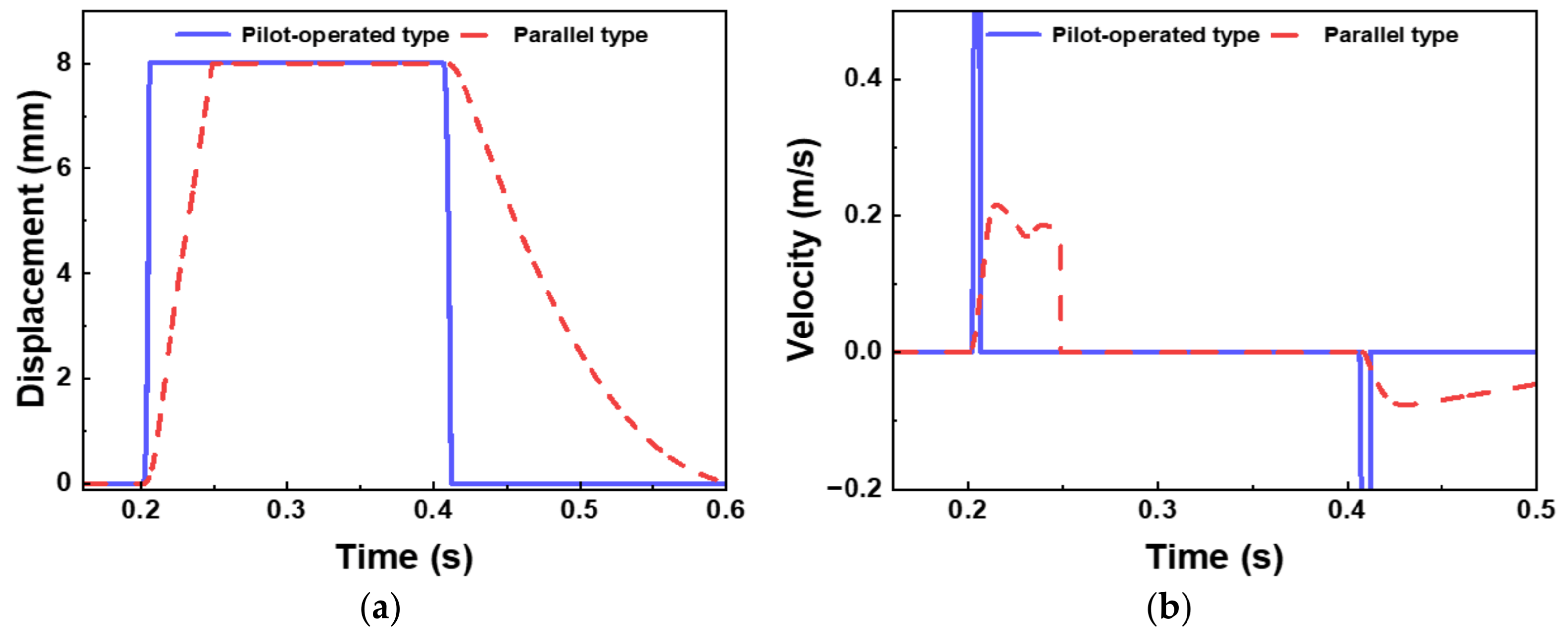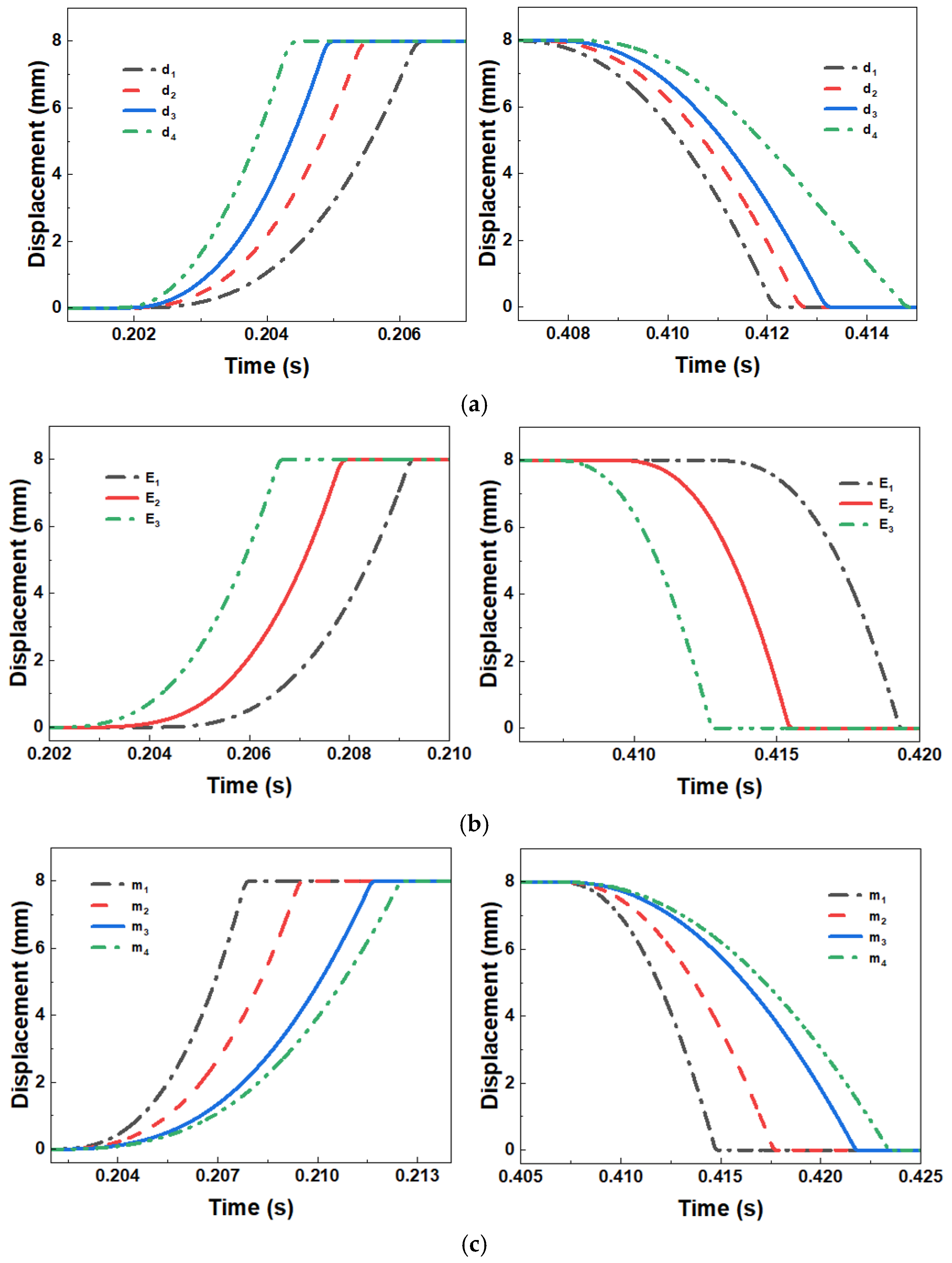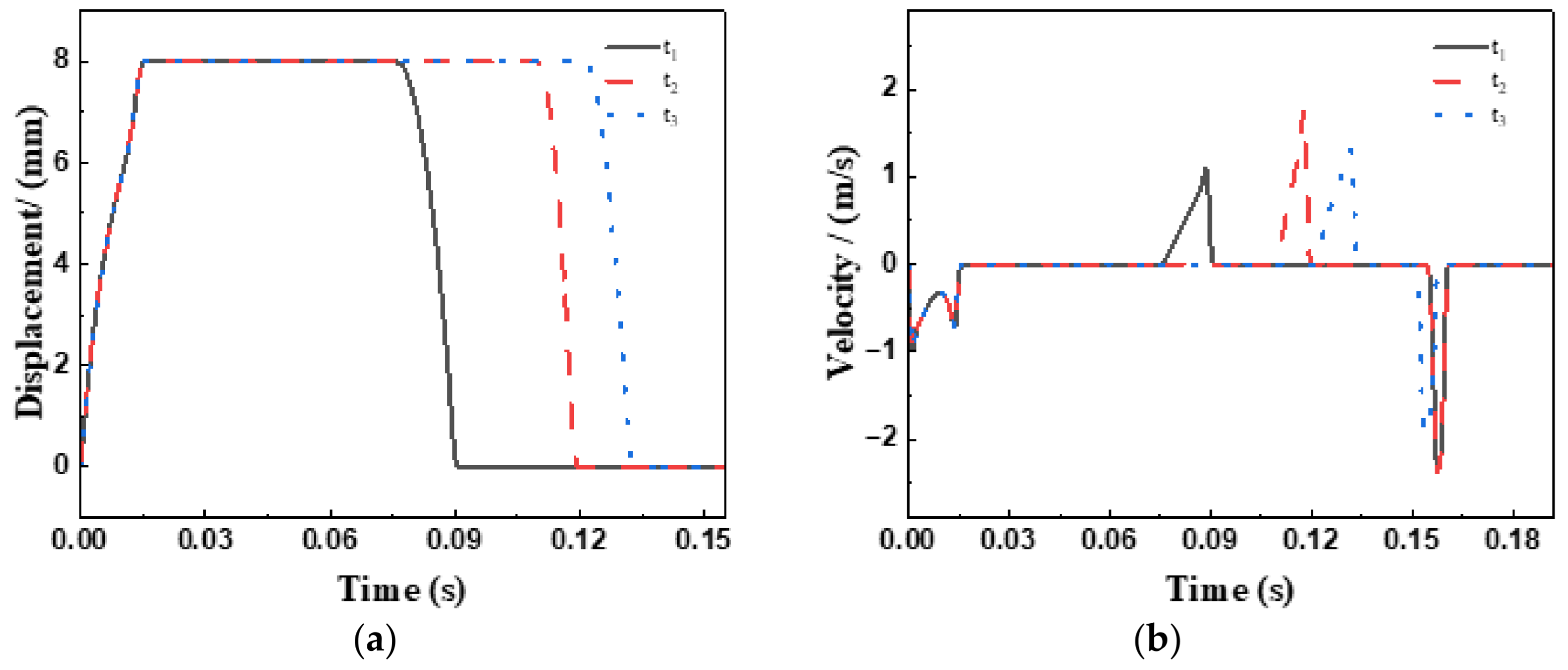 - Concerning motion transmission characteristics, as shown in Figure 12, a significant motion transmission delay is observed between the load displacement signal and the command signal, measuring 28.4 ms for the opening stroke and 34.7 ms for the closing stroke.