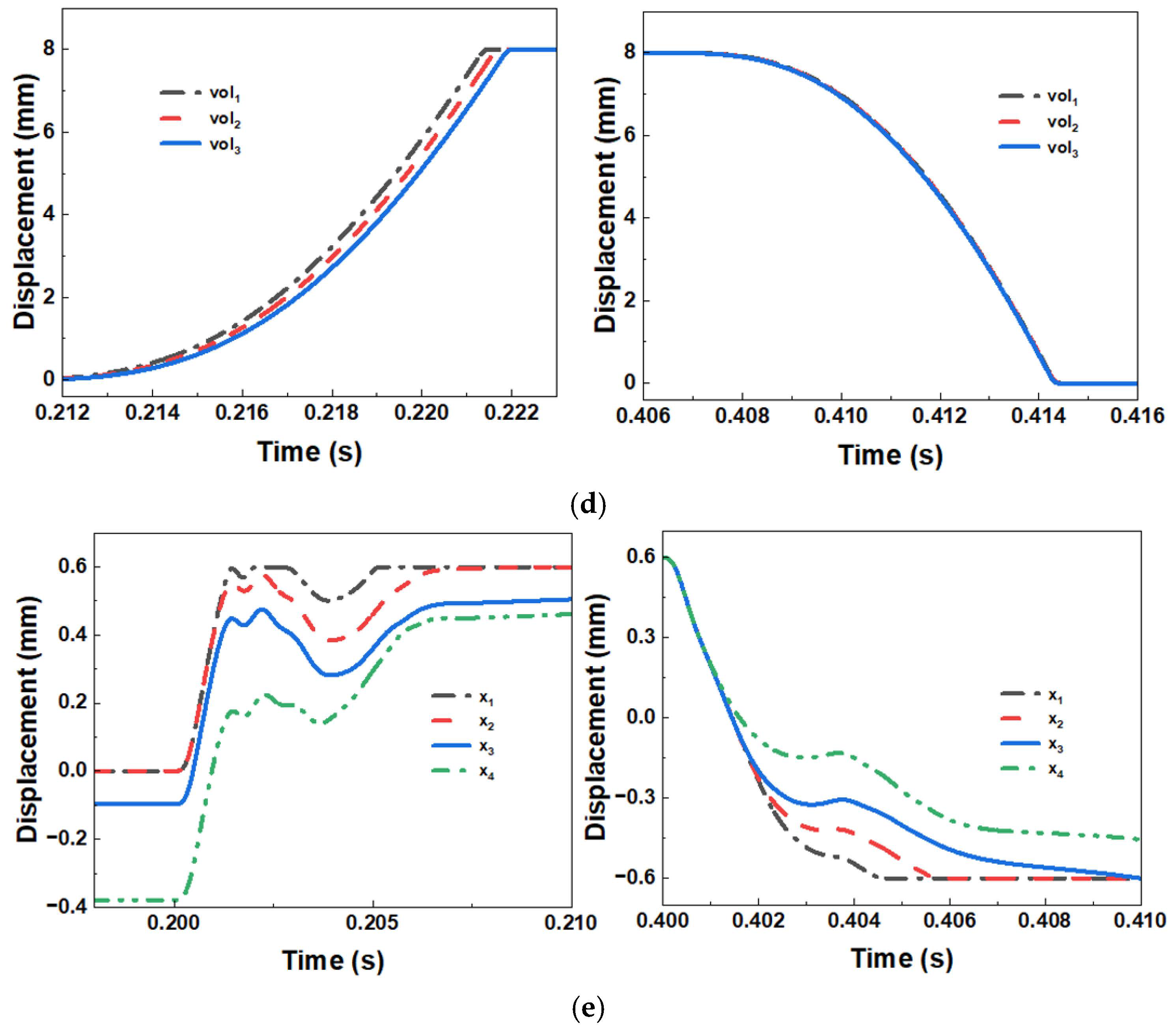 - A strong correlation is observed between control chamber volume and the dynamic performance of the actuator—when volume is reduced from 50 cm3 to 20 cm3, the opening delay time decreases by 32% (15 ms → 10.2 ms) and the closing delay time by 28% (22 ms → 15.8 ms);