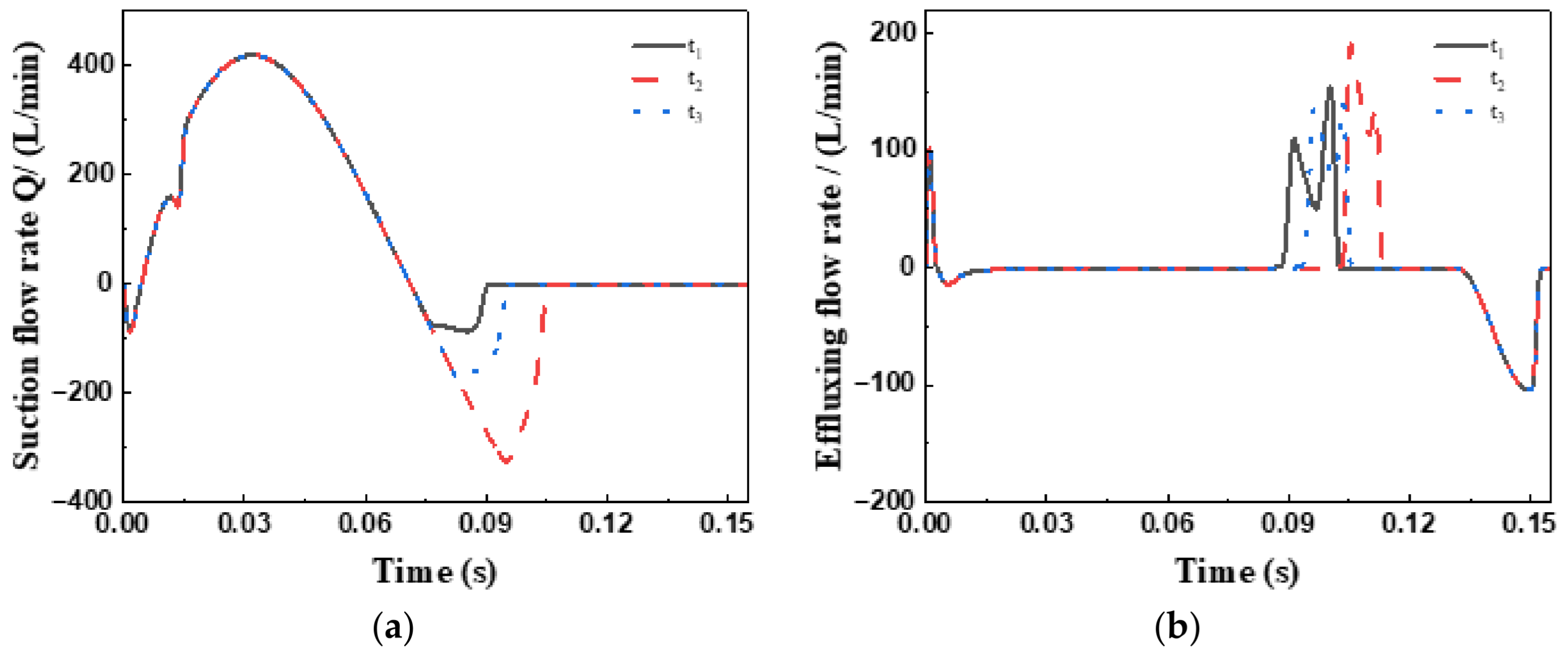 | Plunger displacement (m) | Instantaneous flow rates through the suction valve and discharge valve (m3·s−1) | ||
