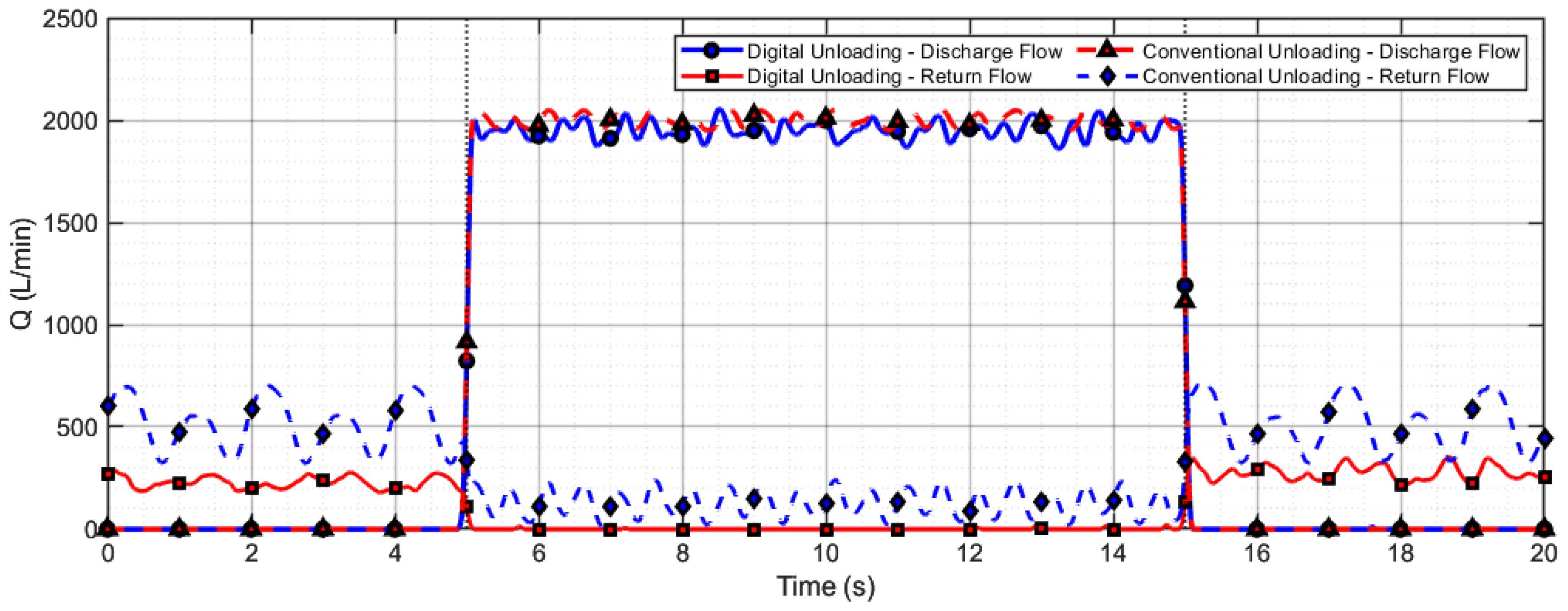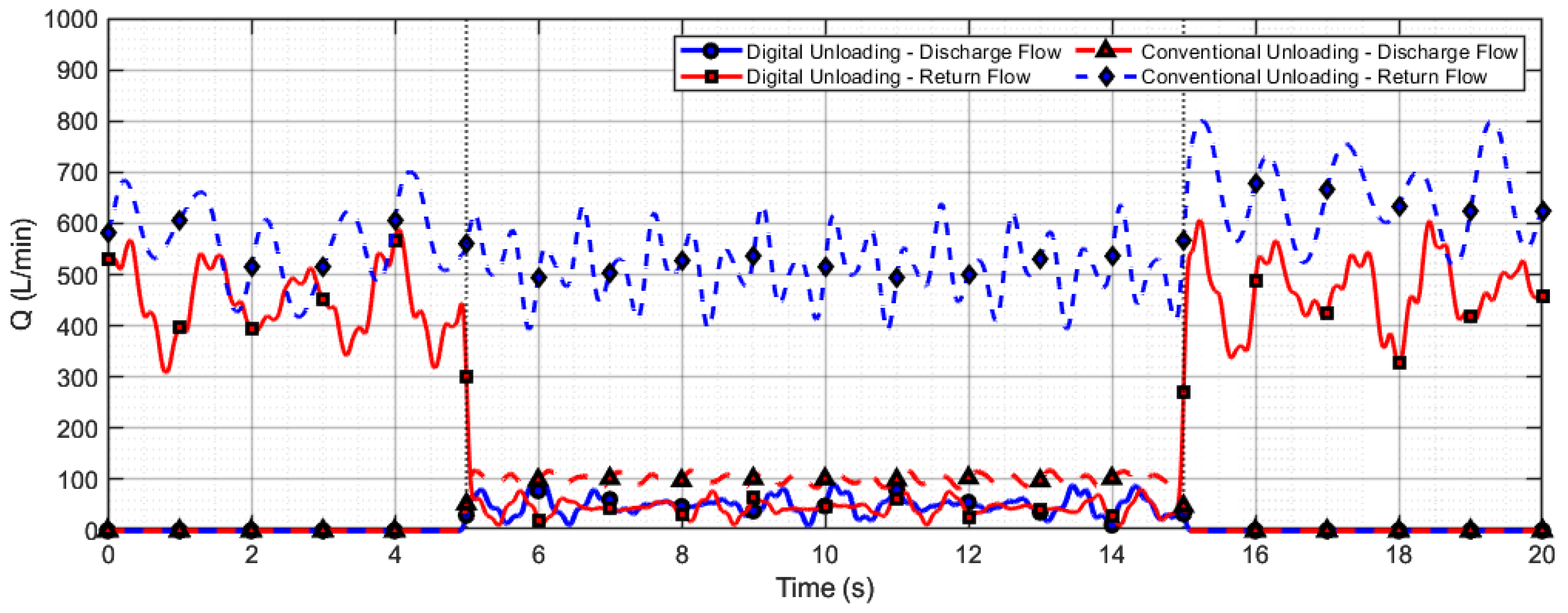 - Verified digital flow regulation: A multi-physics field collaborative simulation model was established, which can accurately capture the dynamic interactions among the pilot electromagnetic valve, hydraulic pulsation, and actuator movement. The experimental results show that by precisely controlling the phase angle of the pilot valve closure to achieve the delay of the actuator, the pump output flow can be regulated. This system achieved a flow control range of up to 83% under load conditions, significantly better than the 57% range observed under no-load conditions. This indicates that it has a wider control range in dealing with actual load fluctuations.