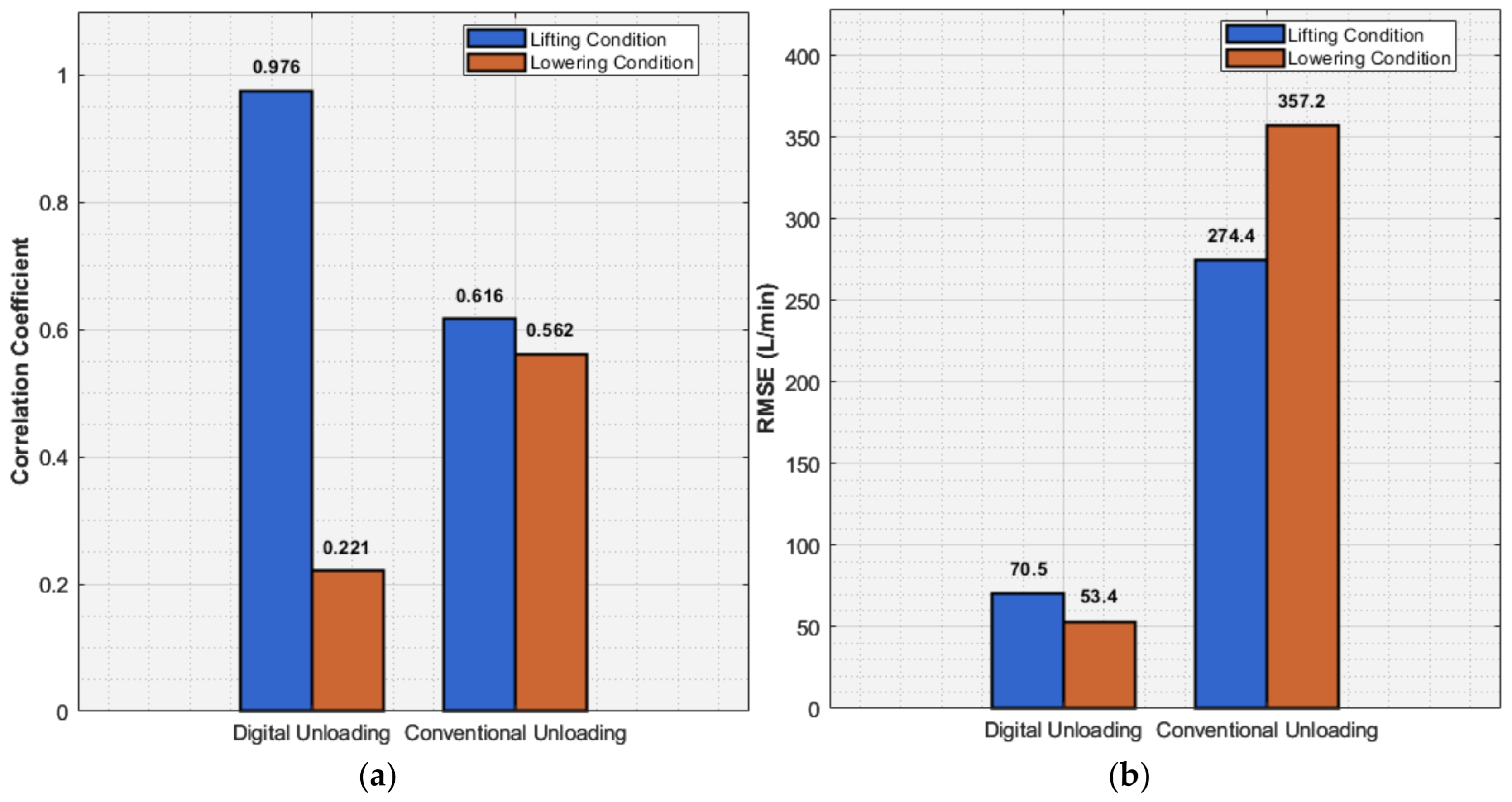 - Superior Performance of the Multi-Sensor Digital Unloading Strategy: The proposed digital unloading strategy overcomes the slow response and hysteresis of traditional methods. Based on a dynamic mapping model, it achieves a control correlation coefficient of 0.976 under lifting conditions, far surpassing the 0.616 of the conventional method, while reducing the flow root mean square error to 70.5 L/min (vs. 274.4 L/min). This provides a key technical solution for intelligent, adaptive flow control in hydraulic support systems.