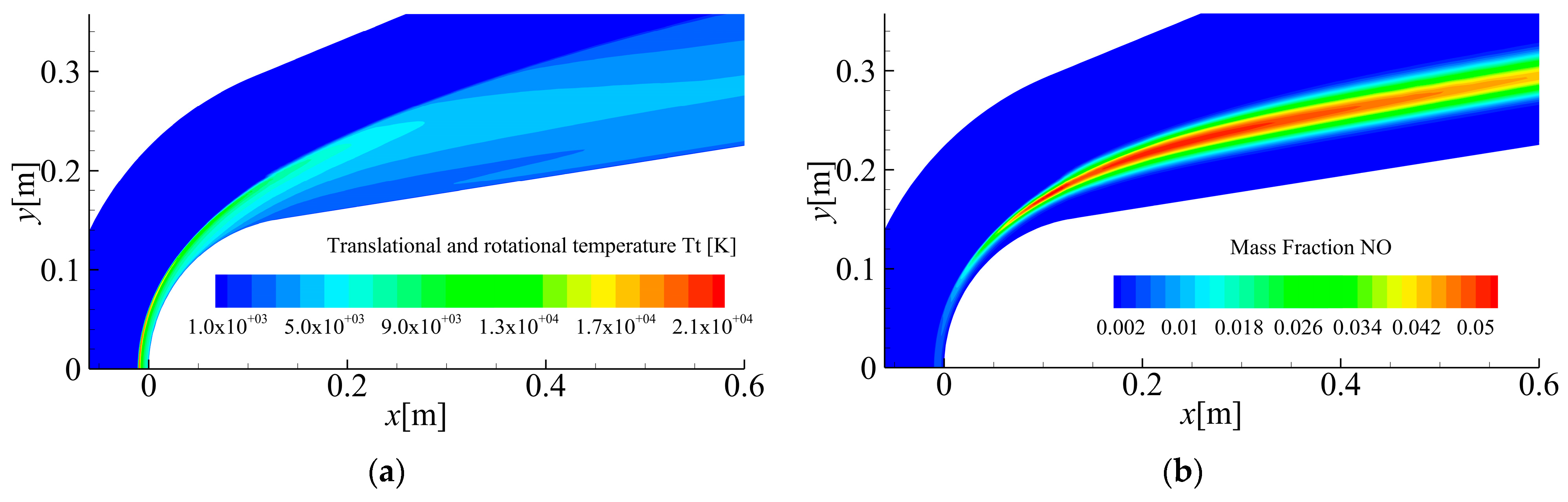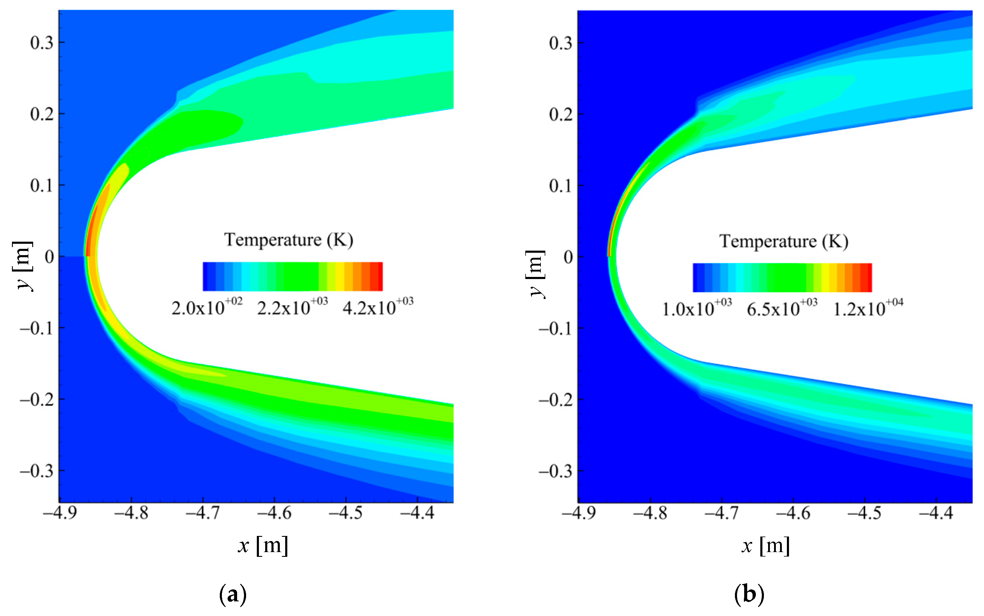 - Tchuen, G.; Zeitoun, D.E. Computation of weakly ionized air flow in thermochemical nonequilibrium over sphere–cones. Int. J. Heat Fluid Flow 2008, 29, 1393–1401. [Google Scholar] [CrossRef]