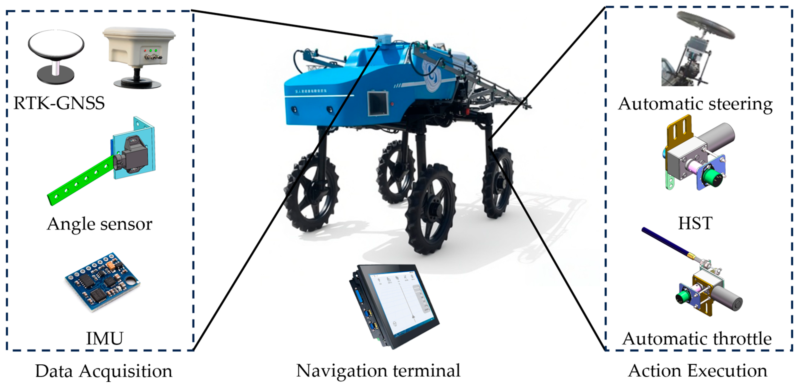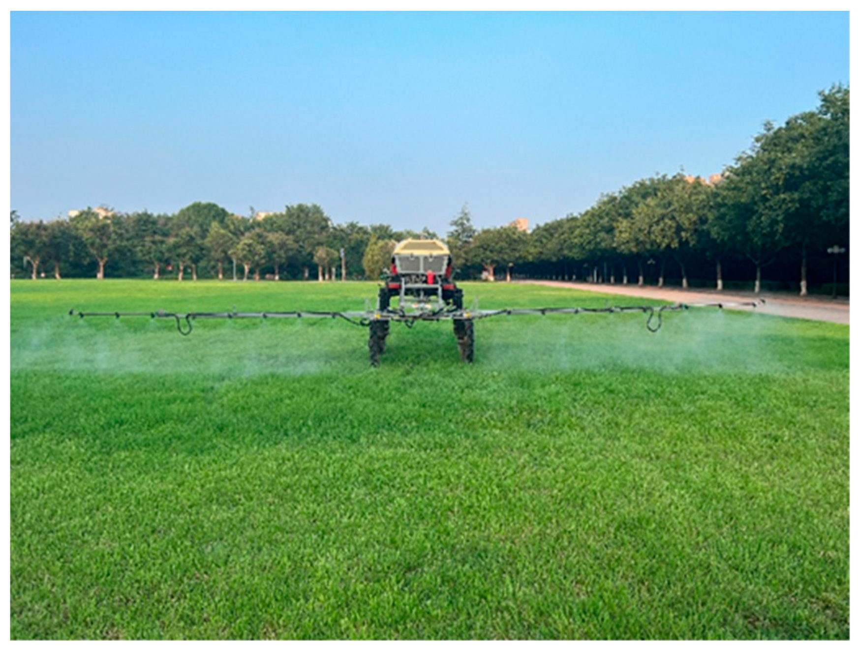 - Yin, X.; An, J.H.; Wang, Y.X.; Wang, Y.K.; Jin, C.Q. Development and experiments of the autonomous driving system for high-clearance spraying machines. Trans. Chin. Soc. Agric. Eng. 2021, 37, 22–30. [Google Scholar] [CrossRef]