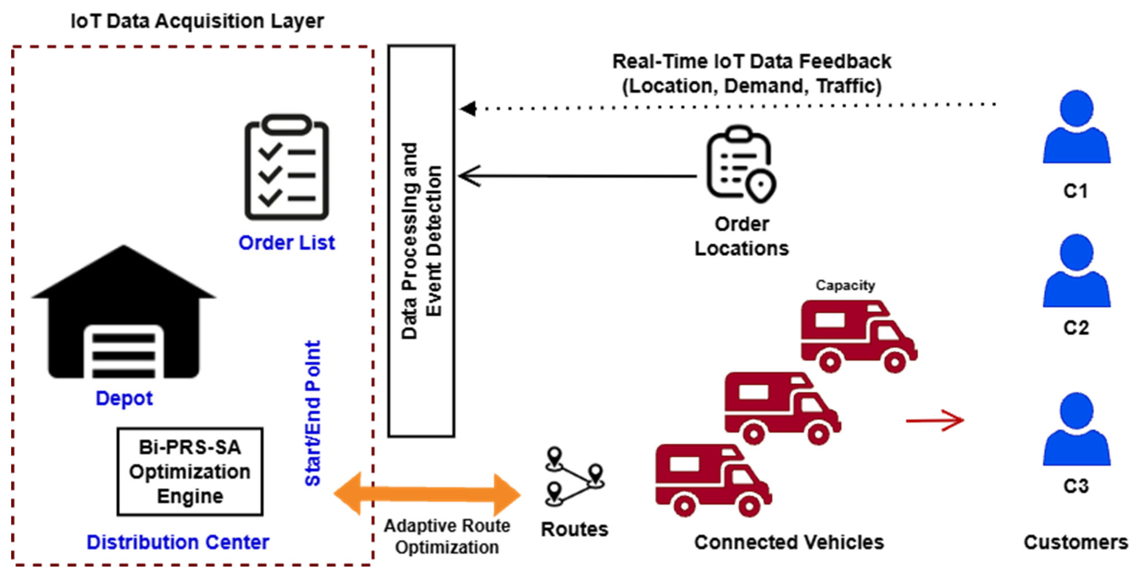 IoT-powered supply chains always have a continuous stream of data being produced, coming from a network of interconnected sensors. In these locations, there is a need for making decisions that can change or adapt in real time, unlike other vehicle routing problems. Therefore, to fill the gap that exists between optimization theory and IoT-powered logistics, there is a need to present a new concept of IoT’s integration with its respective data, which will be presented along with a new optimization algorithm, Bi-PRS-SA.