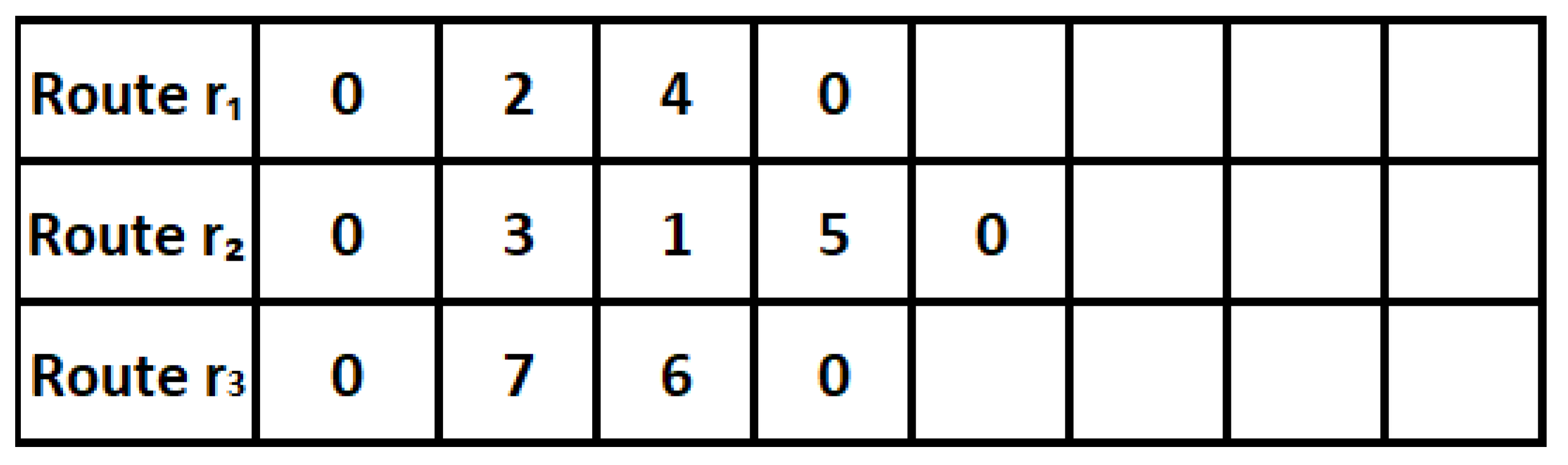 Figure 2 illustrates an example of a solution representation. Here, the rows denote the vehicles, and the columns denote the position within the sequence of the customers. The numbers, like the 2 in the first row (R1), denote that the first vehicle goes to the second customer first, while the 4 in the first row denotes that the next visit in the sequence is to the fourth customer. The blank space denotes that the route has come to an end.