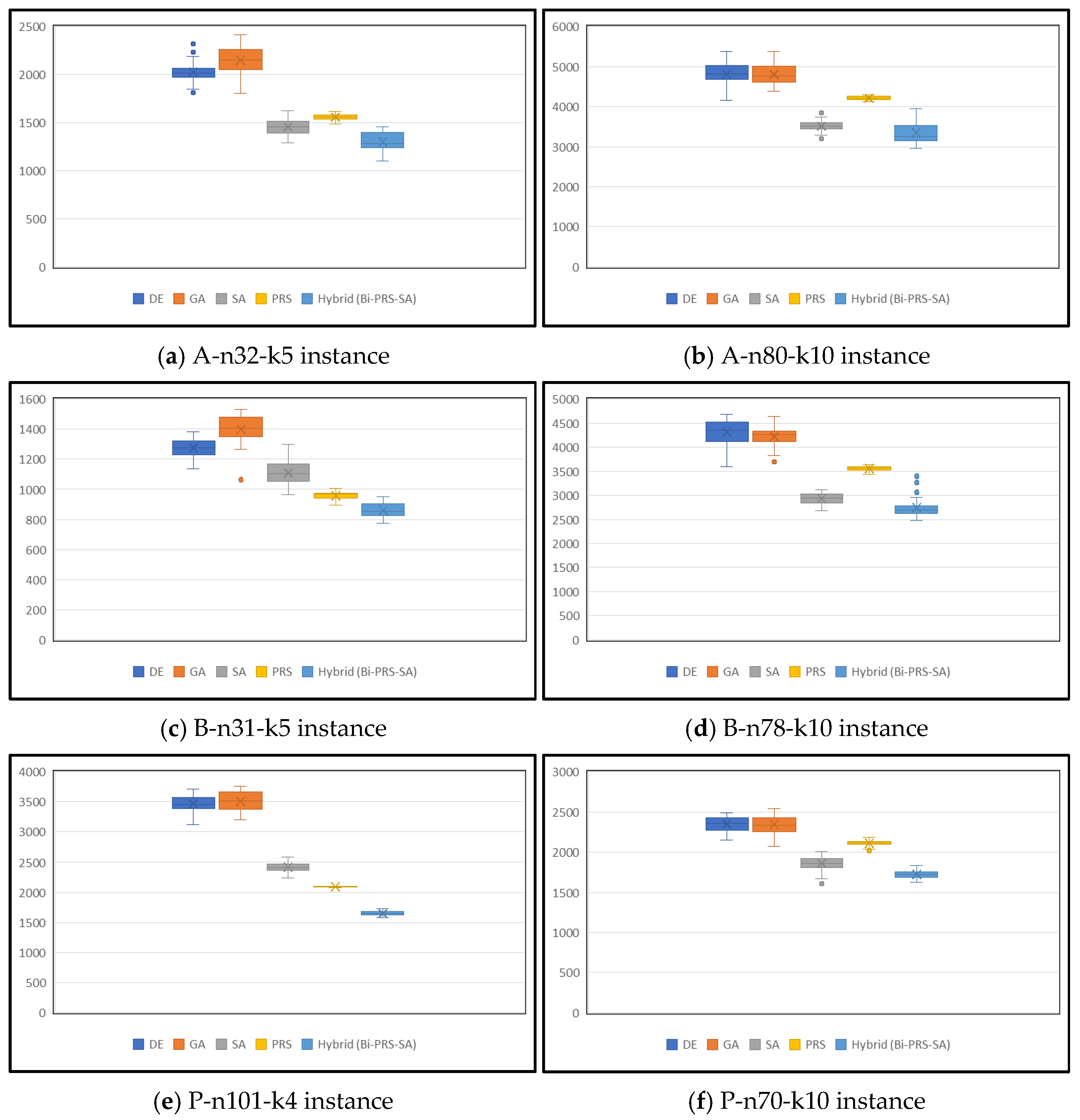 The efficiency of the algorithm was checked by computing the average of the total distance of the generated routes for 30 executions. Differences between the distributions of the proposed Bi-PRS-SA algorithm and other algorithms are shown using box–whisker plots. In the experiments, four algorithms are compared—DE only, GA only, SA only, and PRS only—with the same settings. In addition, the Bi-PRS-SA algorithm was included. All the algorithms were executed with the same settings, and the obtained values were registered to obtain the average cost. Box plots show the distribution of the obtained results and the efficiency of the approach.