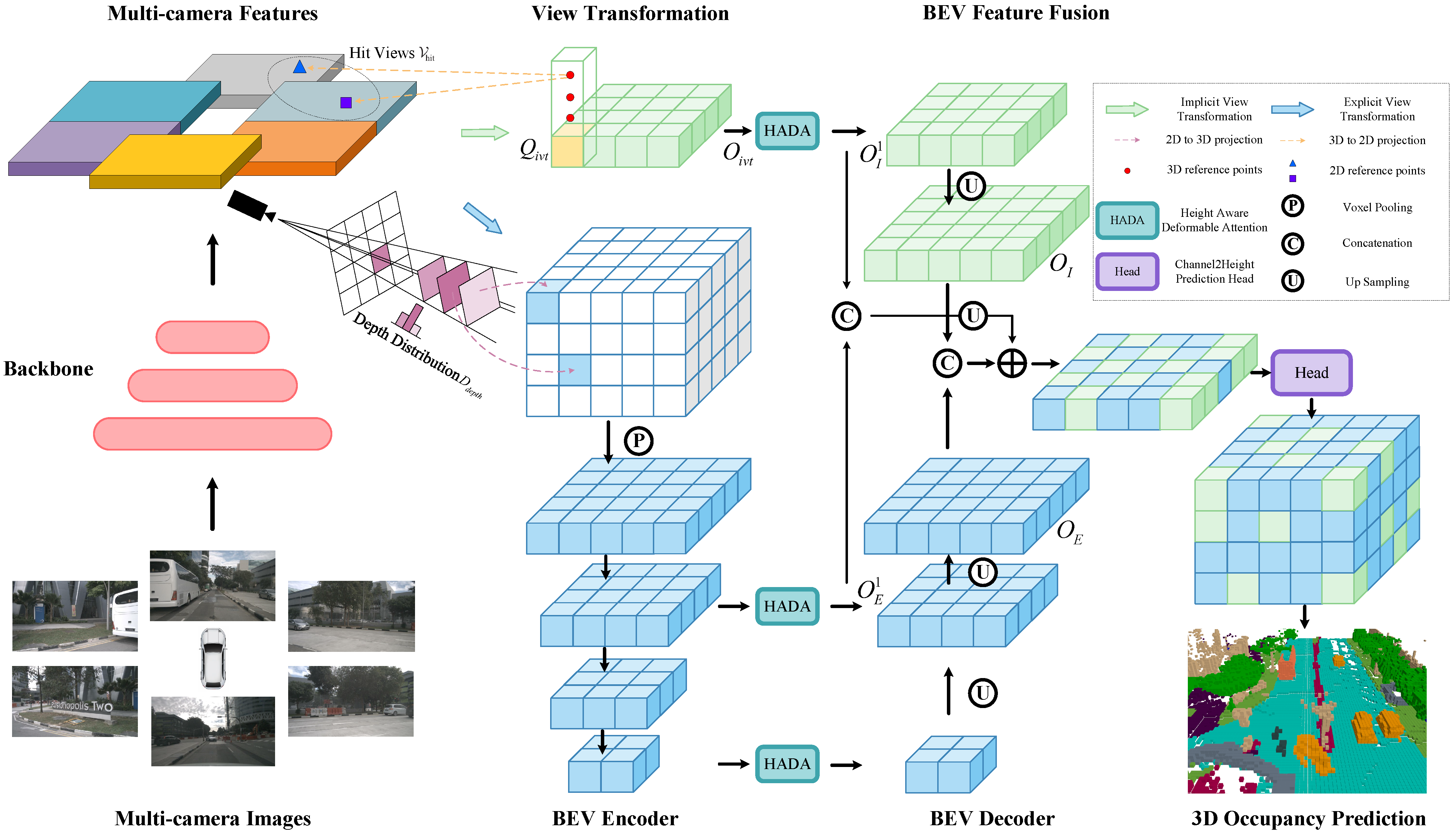 - Our proposed method learns 3D occupancy prediction from multi-camera images through both explicit and implicit view transformations. It enables the efficient fusion of explicit, implicit, and multi-scale BEV features, significantly reducing the memory usage of 3D occupancy prediction whilst maintaining high performance. To further improve height voxel supervision, we introduce a height-aware voxel loss with adaptive weighting along the height axis.