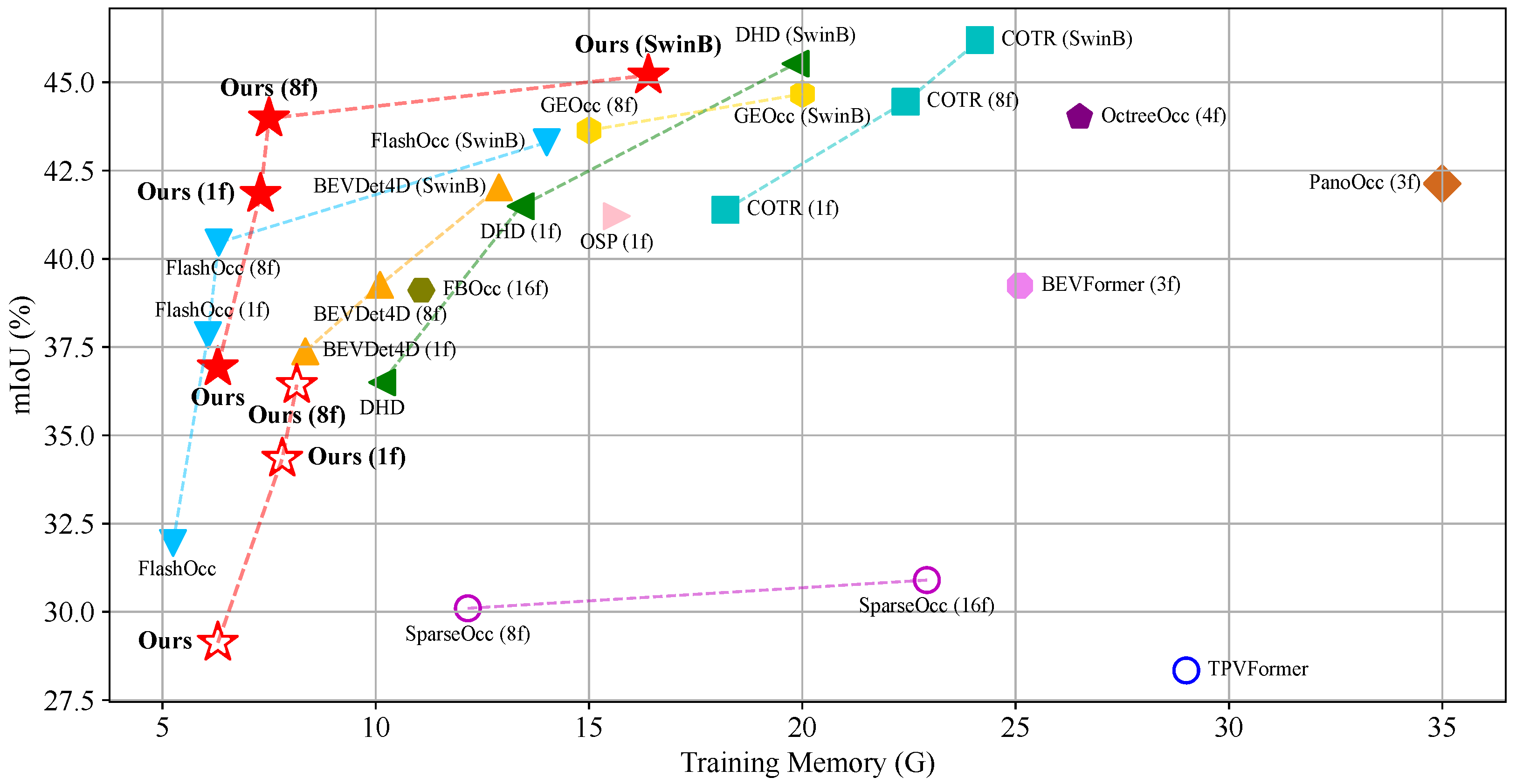 | History Frames | Height | mIoU (%) ↑ | Training Mem (G) ↓ | Inference Mem (G) ↓ | Params (M) | GFLOPs |