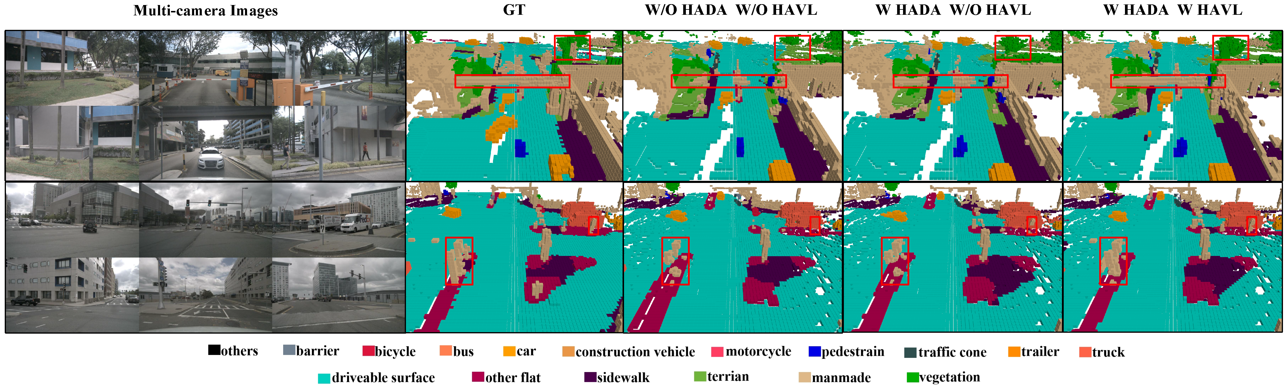 | Baeline | EVT | IVT | HADA | HAVL | RayIoU (%) ↑ | mAVE ↓ | Training Mem (G) ↓ | Inference Mem (G) ↓ | Params (M) | GFLOPs |