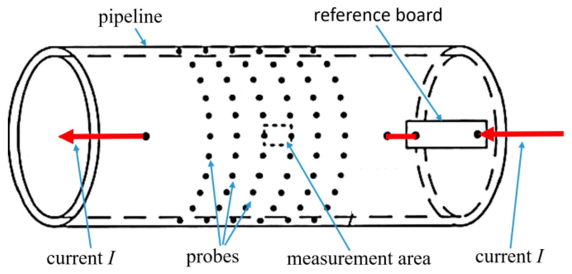 6]. The field signature method (FSM) is an online monitoring method for metal pipeline corrosion based on potential arrays. It indirectly obtains the change in pipeline resistance by measuring the voltage variation between the external probes of the pipeline, and finally calculates the change in pipeline thickness [