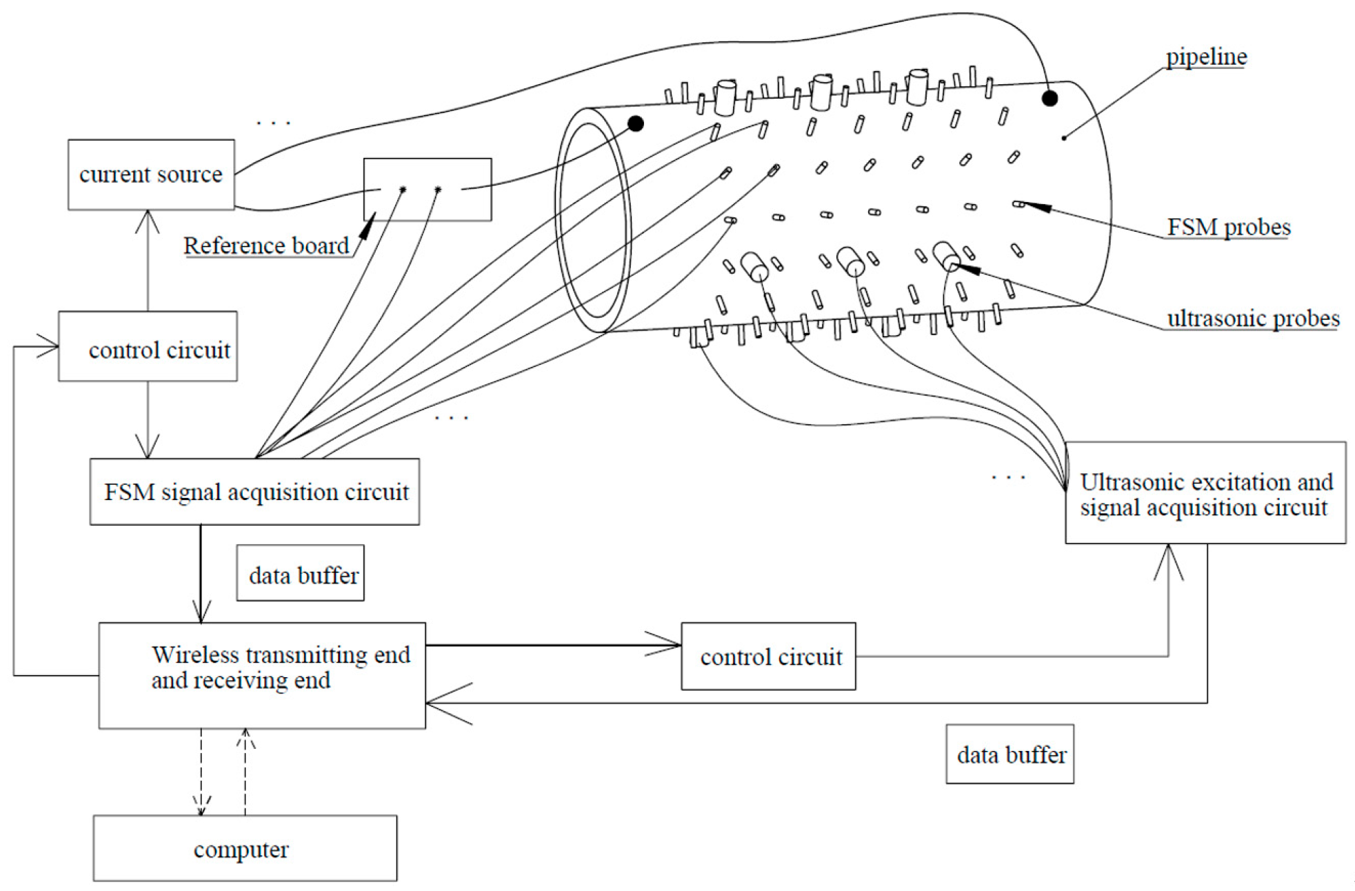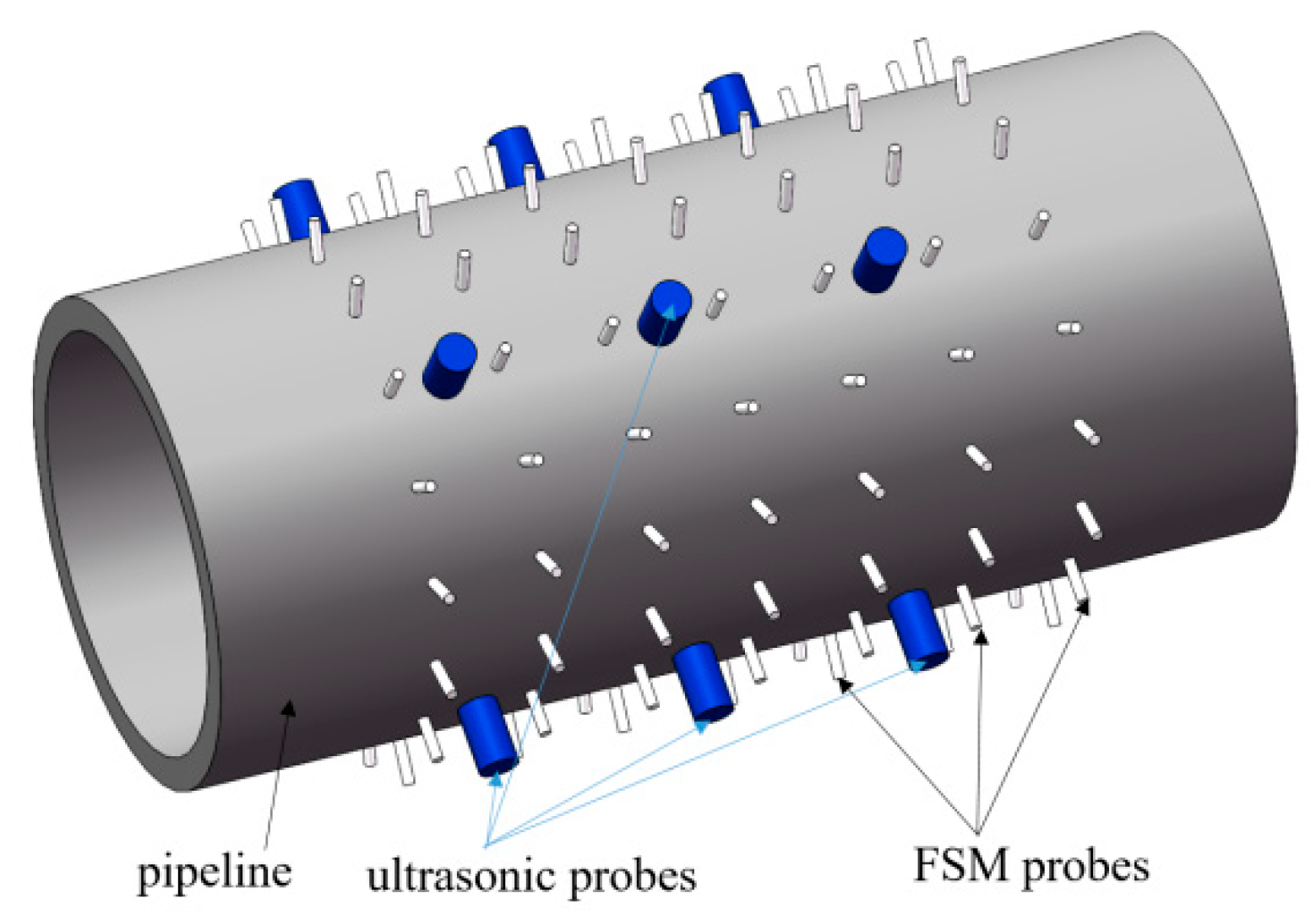 The multi-sensor monitoring model of pipeline corrosion adopted in this paper consists of FSM probes and ultrasonic sensors. The probes of the FSM system are arranged in a matrix along the axial and circumferential directions of the pipeline. Additionally, the probes of the ultrasonic system are coupled to the outer surface of the pipeline and several ultrasonic probes are also arranged in a matrix (