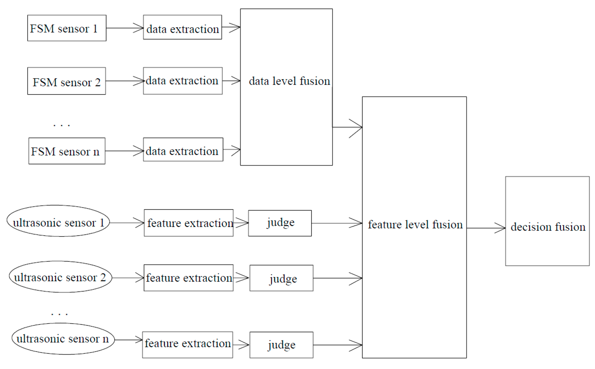 Figure 4. Through data extraction, the original voltage signals collected by each pair of FSM probes are obtained. These FC values form a matrix network corresponding to the pipeline. This matrix is obtained through temperature correction and the elimination of drag effect. Through the remaining thickness algorithm, the remaining thickness matrix of the pipeline is obtained. This matrix corresponds to the actual remaining thickness of the pipeline and is the result of the fusion of the FSM system. From the echo data collected by each ultrasonic probe, the feature quantity t (time of flight) through certain methods is obtained, and then the remaining thickness of the pipeline under the probe area is obtained according to the algorithm. According to the multi-sensor distribution model, the results obtained by ultrasonic probes correspond to those of FSM probes. The remaining thickness data obtained by the two systems at the same position are explained and conclusions are drawn at the decision fusion layer.