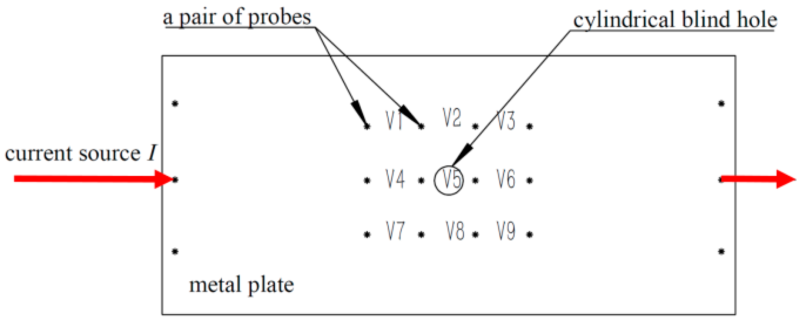 Figure 6). The cylindrical blind holes are located between each pair of probes. There are a total of nine pairs of probe voltage data, which form the voltage matrix